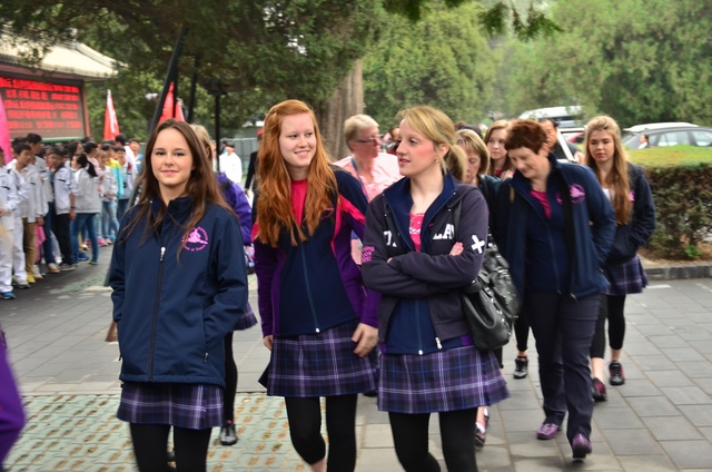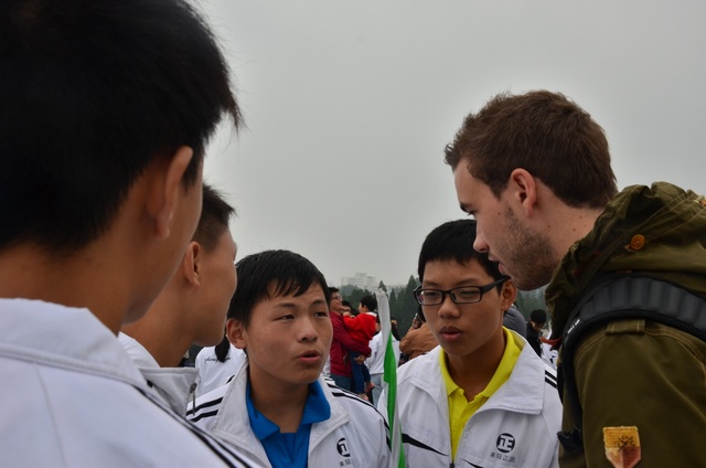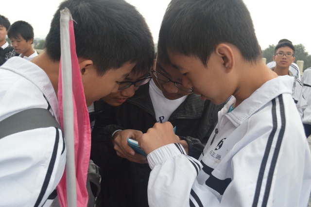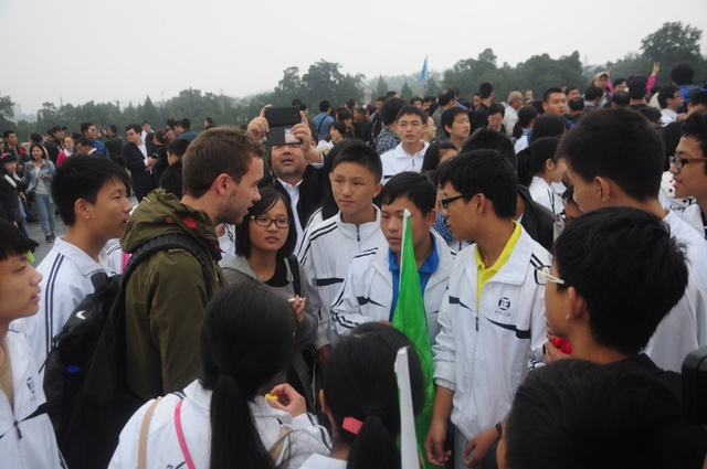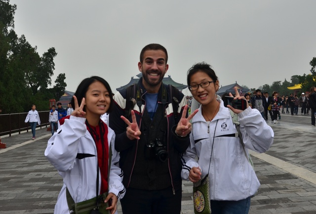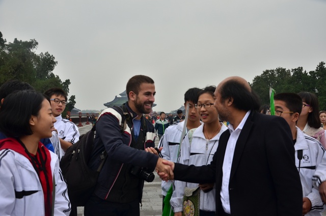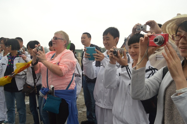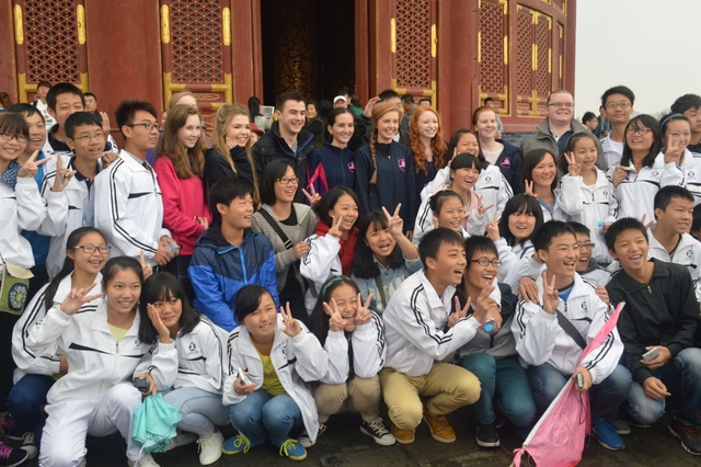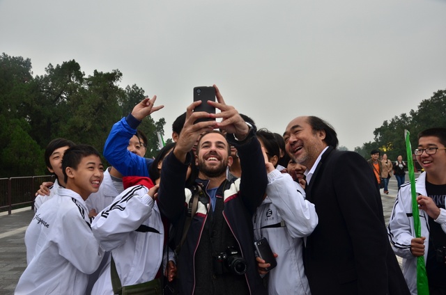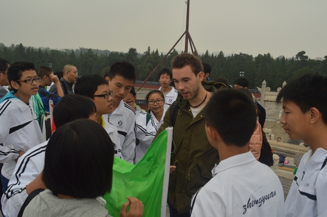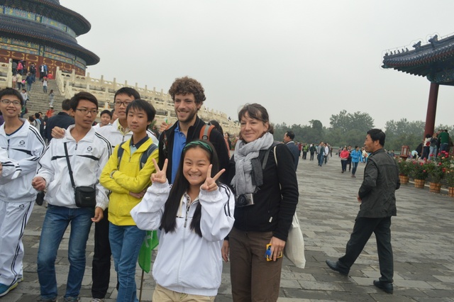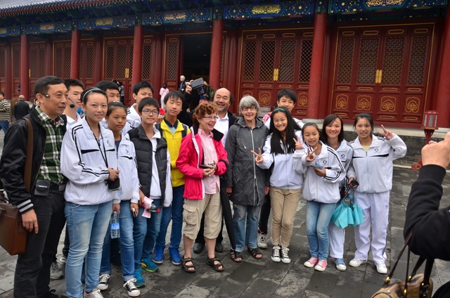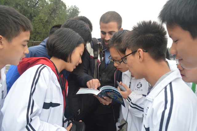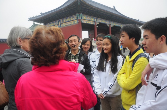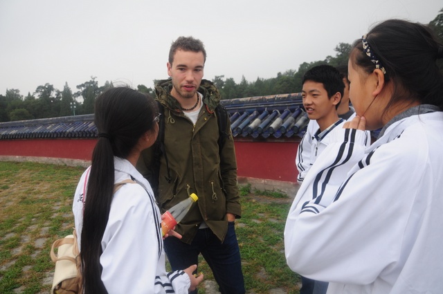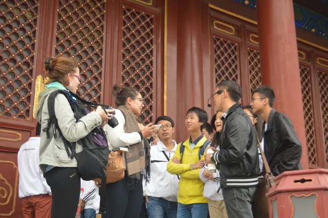 在游览的过程中,有好几拨外国游客也来到了天坛参观。高72班的李智凤,高74班的邓雨茜、肖珊珊、王钦镜,高88班的刘姣等同学抓住机会和外国友人对话来历练自己的英语口语,并且也顺便教教老外的汉语。正如近代伟大思想家魏源所说“师夷长技以制夷”。