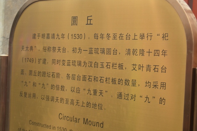 祭天历史源远流长,可以追溯到五帝和商周时期,而且祭天礼仪程序严谨规范。天坛的修建和修缮过程中融入了很多中国元素以及古人的智慧。比如说天坛坛墙两重,形成内外坛,坛墙南方北圆,象征天圆地方;两坛之间的丹陛桥北高南低,北行步步登高,如临天庭;回音壁的声波反射良好,圆周率计算精确,让人分别立在东西两璧能一呼一应,一问一答,妙趣横生,等等。