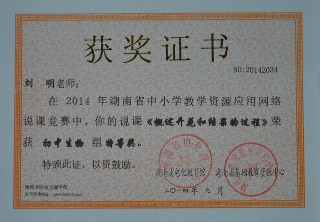 9月29日,2014湖南省中小学教育资源应用网络说课竞赛决赛历经两天的紧张角逐落下帷幕,我校初中部生物教师刘明以《概述开花和结果的过程》一课,力挫群雄,摘获省特等奖桂冠。