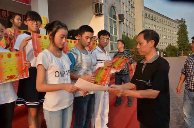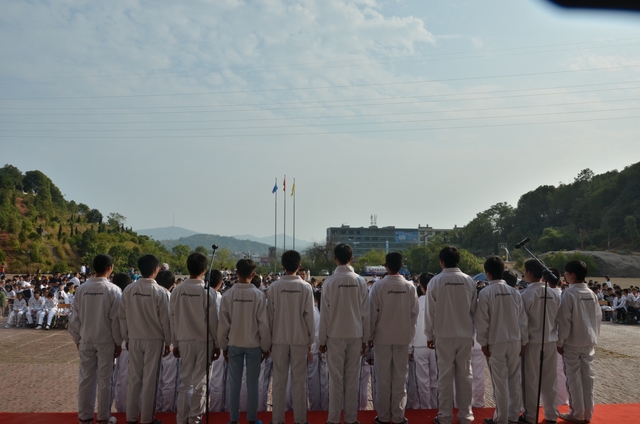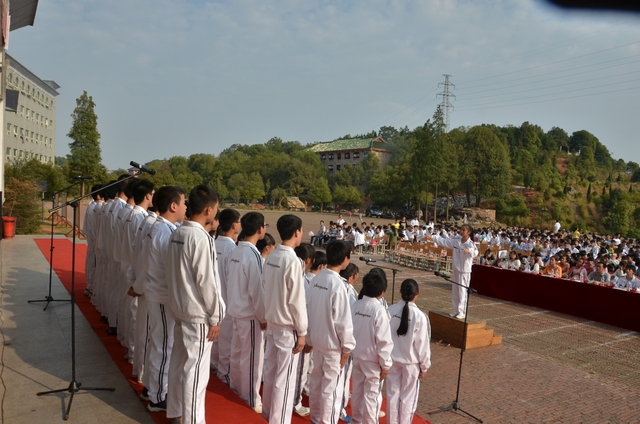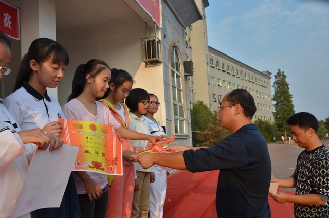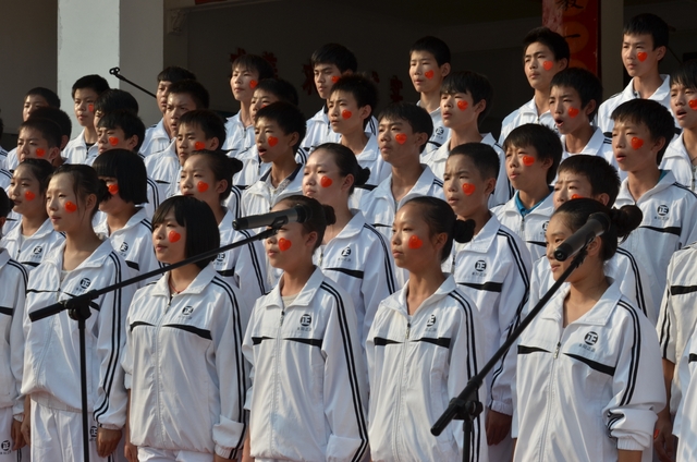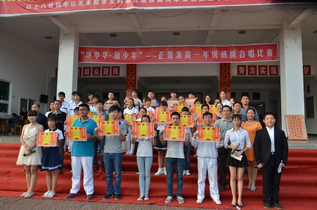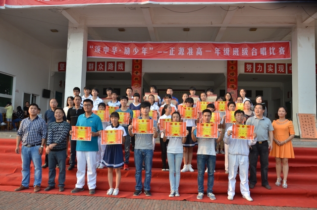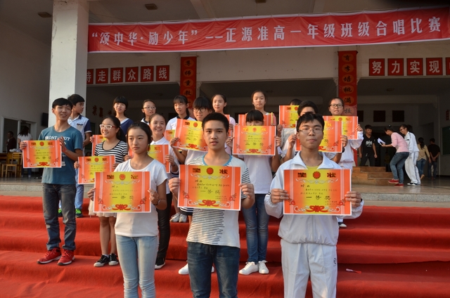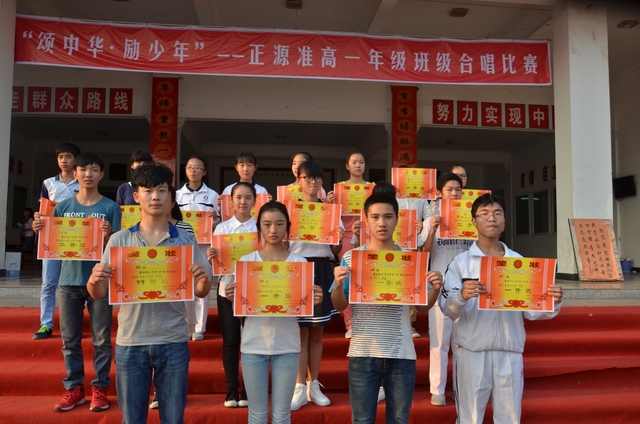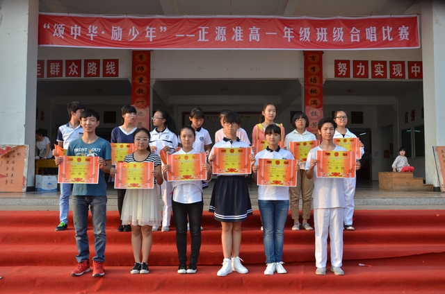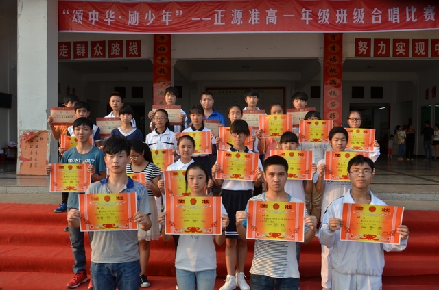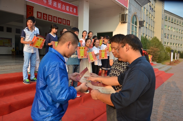 下午2点,18个班级的同学带着凳子,按”8X8”的方阵坐到了指定的位置。烈日当空,骄阳似火,可同学们依然热情高涨。当三个主持人出现在前台的时候,现场响起了雷鸣般的掌声。比赛按照抽签顺序,每班演唱一首爱国歌曲和一首励志歌曲,评委现场打分,当场公布分数。比赛开始,一首首雄壮而又激昂的乐曲回荡在校园中,统一的着装,整齐的方阵,同学们个个精神饱满,会场不时响起一阵阵热烈的掌声和加油助威声。经过激烈而紧张的角逐,H102班摘取了此次比赛的最高奖——特等奖。H99班李娴同学获得了“个人最佳指挥奖”。比赛还评选出“最佳爱国歌曲奖”以及“最佳励志歌曲奖”。经过年级学生会的评选,H102班同时获得了“最佳道德风尚奖”。最后,比赛在全场师生的一曲《我相信》中结束。