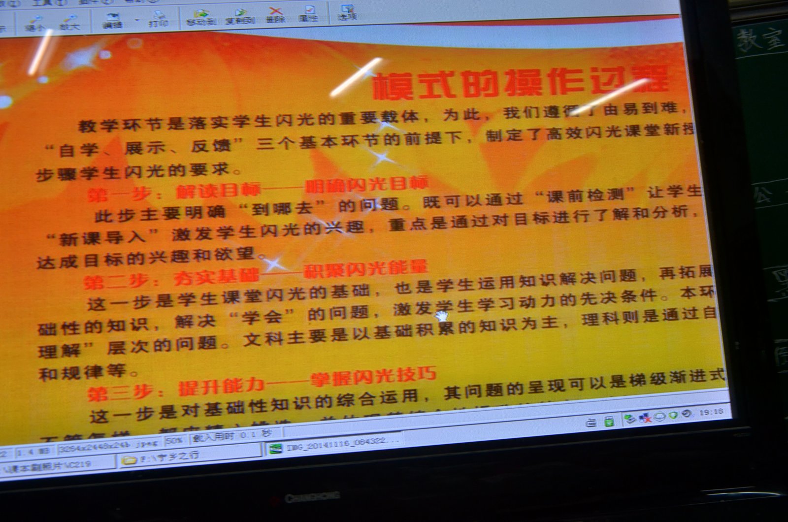 “五三三”高效闪光课堂教学模式即新授课的五部流程:解读目标------夯实基础------提升能力------总结梳理------过关检测;第一个“三”即自学------展示------反馈三种学习方式;第二个“三”指模式构建的三个要点,即课型------导学案------闪光共同体。高效闪光课堂模式,最大的优点在于它解放了课堂,培养了能力,提升了质量。学生参与度高,课堂气氛活跃,学生能力提升快更是这种模式的闪光点。