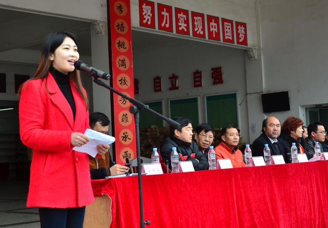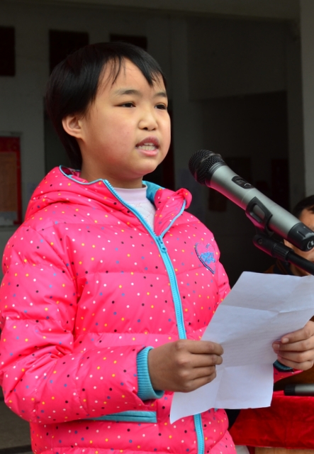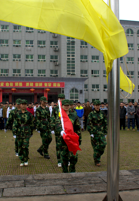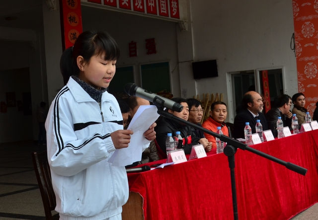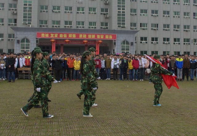 10点18分,大会在学校办公室主任朱明芝的主持下开幕。首先举行升国旗仪式。在悦耳雄壮的国歌声中,只见身着迷彩军服的国旗手将五星红旗和校旗同时升上旗杆顶端。国旗与校旗交相辉映,在空中自由飘荡。