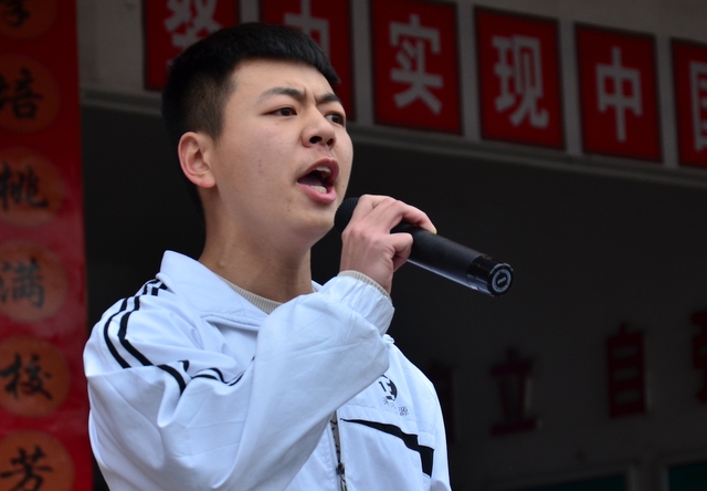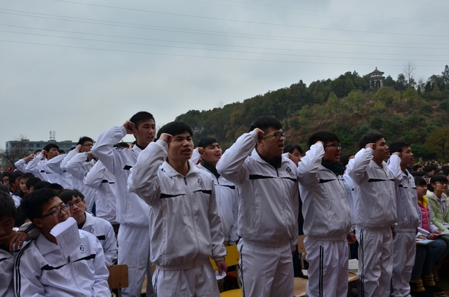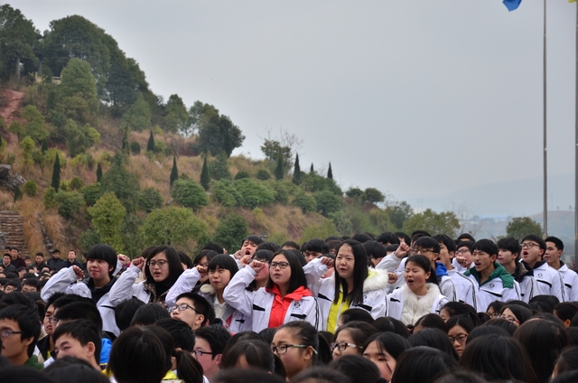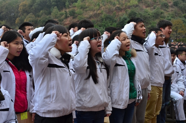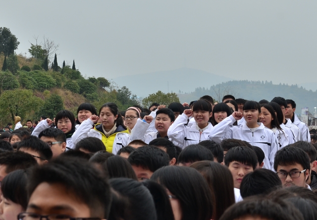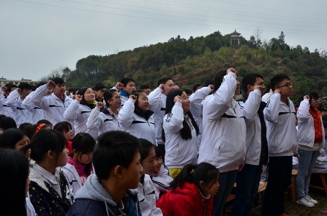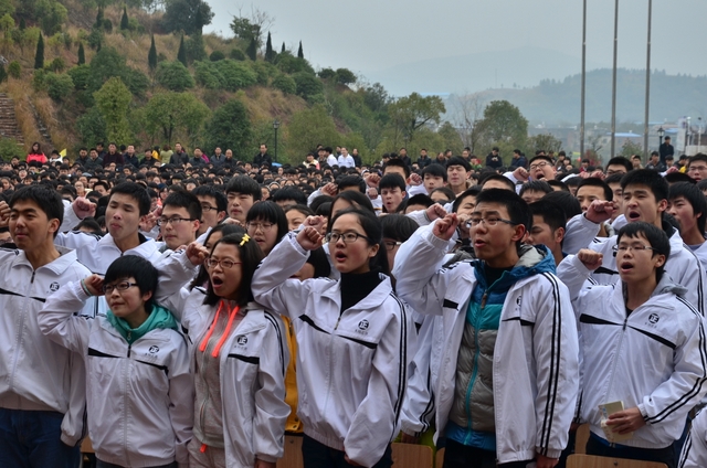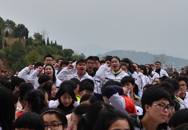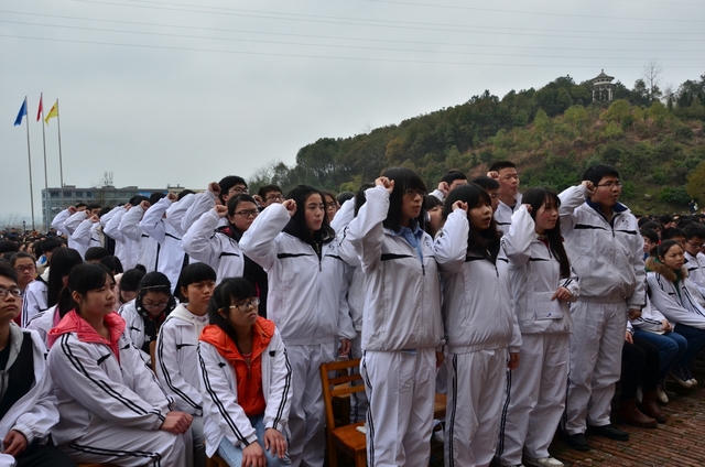 高三学子们举起右手,握紧拳头,信心足,气势磅礴,调子高,大功定成,令人震撼!“十年磨剑,我们定将展露锋芒!”、“沙场点兵,谁能为王?”、“高三鏖战终有日,六月鲜花为我开”、“问鼎问考,谁与争锋?”、“奋斗一百天,让雄心与智慧闪光”、 “宁吃百日苦,不留终生憾”…… 铮铮誓言,振聋发聩。