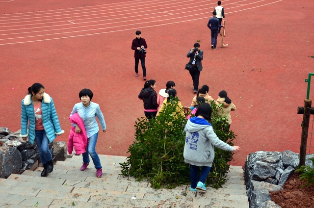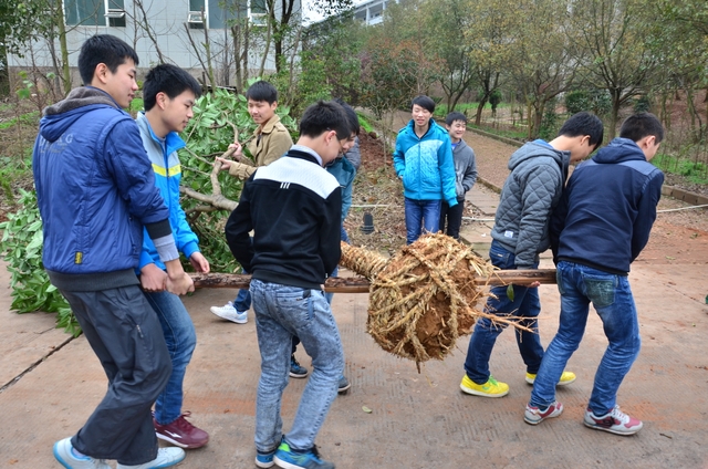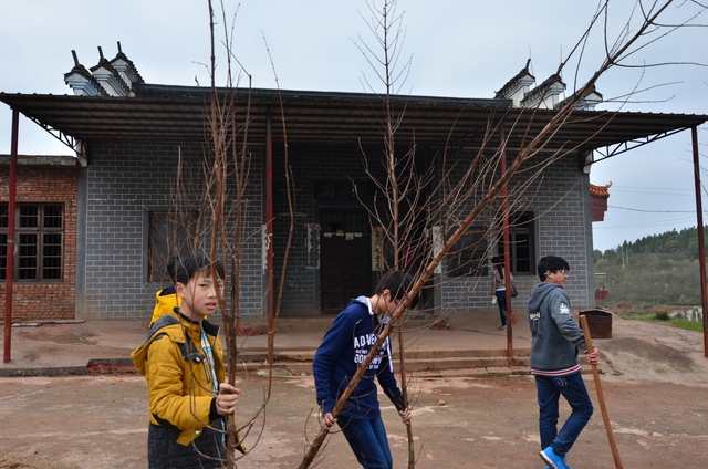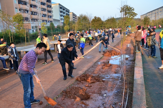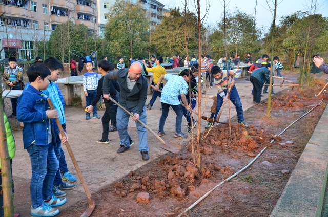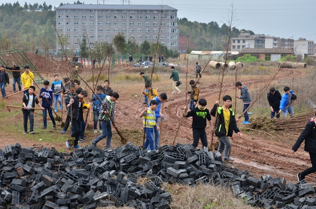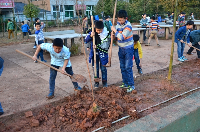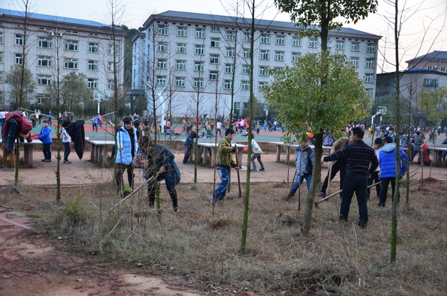 晚饭后六点钟左右,小学部五六年级的学生也不甘落后,在年级主任以及各班班主任的带领下纷纷捋起柚子,挥起锄头在小学部运动场周围植起树来。