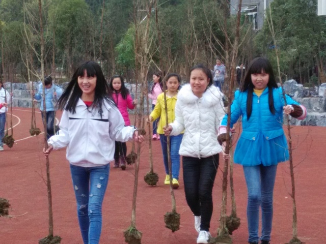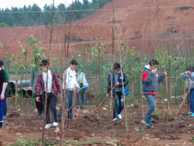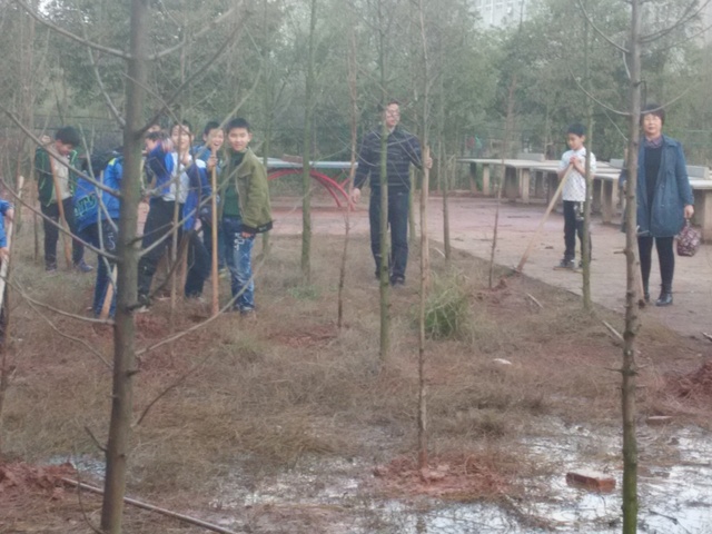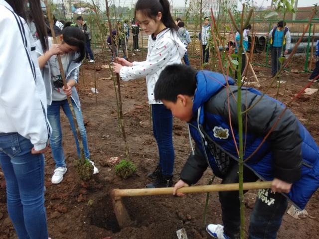 今天下午,C222班、C228班100多名同学在年级唐循南主任和各自班主任带领下,来到指定区域,开始人生第一次植树。在团委书记周文根的统一指挥下,各班分区域,分任务,有条不紊进行。女生搬运树苗,男生挖坑培土。一个多小时,200多棵水杉和樟树就“挺立”在校中学生运动场的东边。这些00后的独生子女们,秉承“进校即思进取,怕苦莫来正源”的校训,手握陌生的铁锄头,摆着引人发笑的姿势,挥汗如雨。即使手磨出血泡,他们也不喊苦叫累。