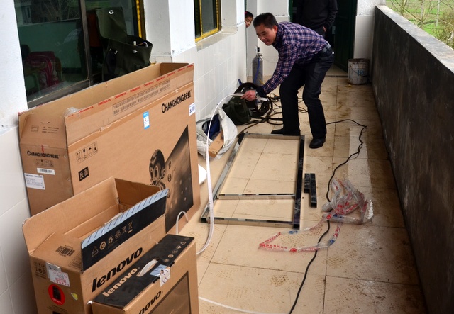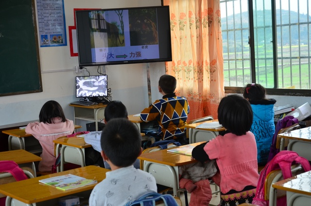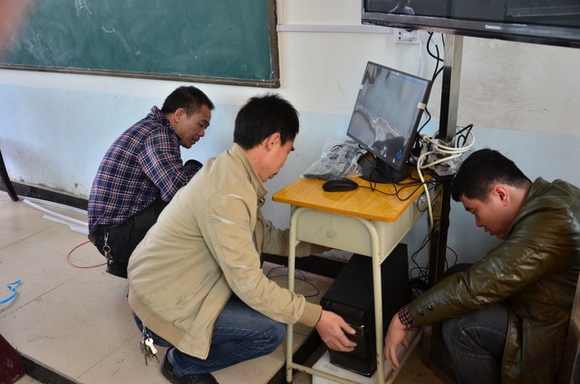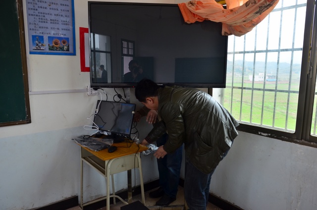 校车一到,同学们欢呼雀跃。看到教室里同学们那一双双渴望的眼睛,我们心情急切而又激动。卸车、拆封、焊接、安装、调试,一个多小时的功夫,一套现代化多媒体电教设备正式“落户”该校三楼三年级教室。校团委书记周文根把一个课件手把手地给该班即将退休的班主任兼语文老师谷老师讲解并做示范。同学们看到图文并茂的课件,拍手称快。