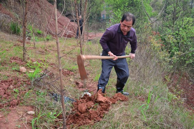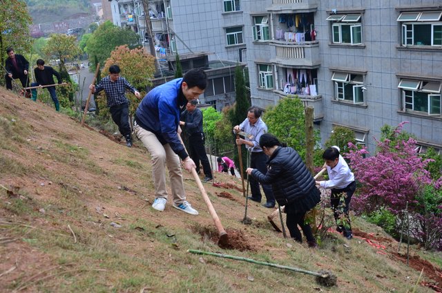 按照要求,大家领了工具找了树苗很快动起来了。植树中,有两人一小组合作的,有单打独斗的,笑声,吆喝声此起彼伏,平时寂静的山坡此时变成了热闹的海洋。在陡坡上,在坚硬的紫页岩上植树,很不容易:70度的陡坡,立足很不容易,紫页岩上,一钁头下去,只有一个浅浅的小坑。人人脸上都沁出了汗珠,不少人脱了衣服,汗流浃背。不管是植树的里手,还是从没种过树的生手,大家都很积极主动,没有出现消极怠工的现象。