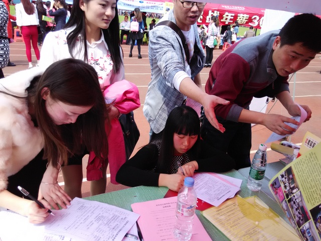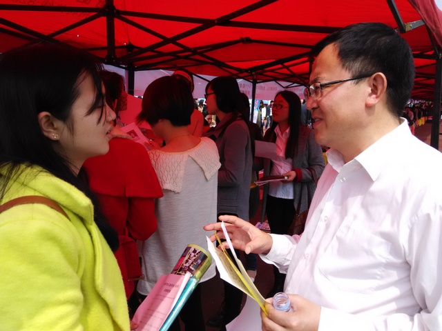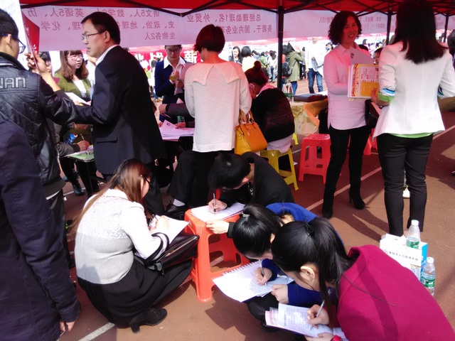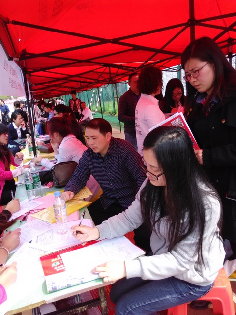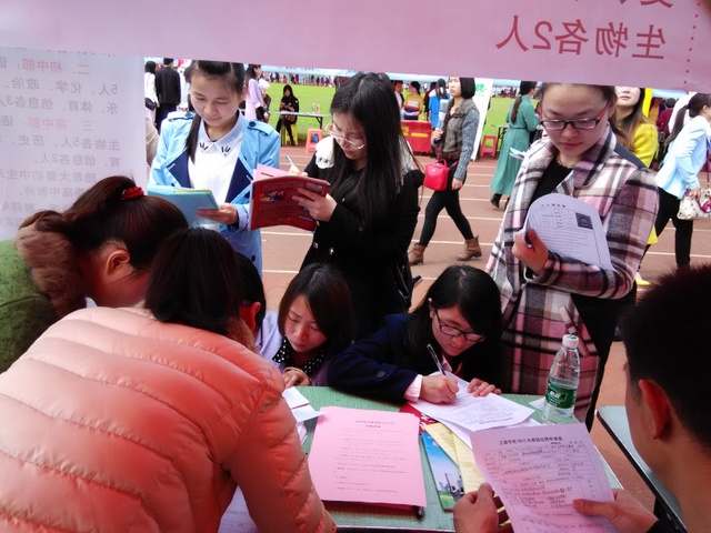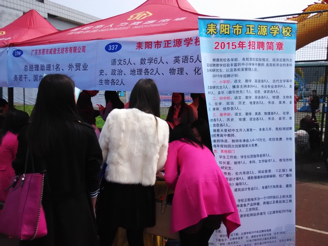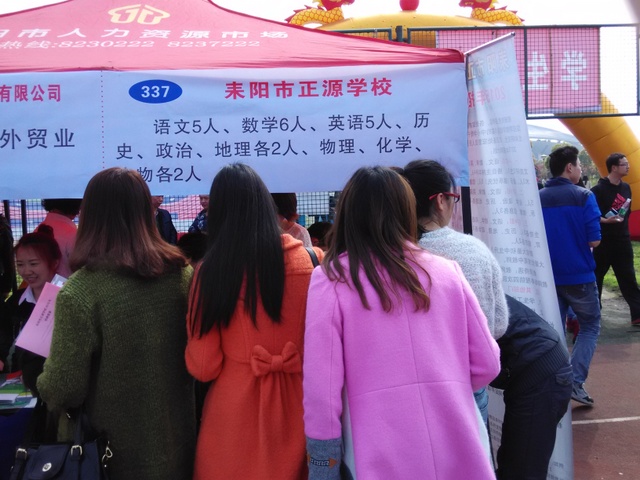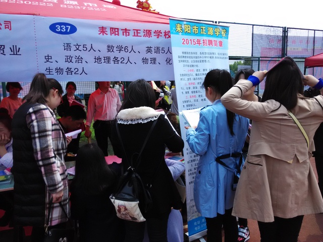 招聘会现场人山人海,热闹非凡。我们一到展位,一位操着衡阳口音的先生说:“你们才来,刚刚好多人在打听你们正源学校呢。”当招聘组成员布好展位、挂好招聘广告后,一大堆的毕业生就围了上来。情况咨询、面试交流、正式填表一切都紧张有序进行。