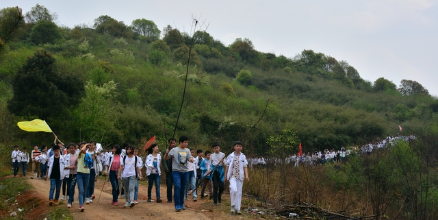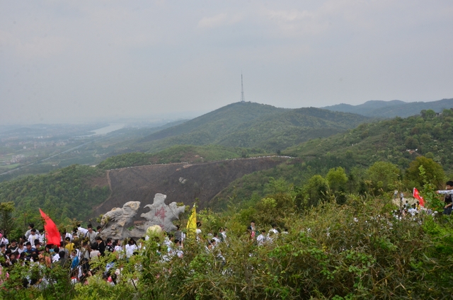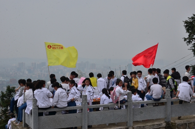 中午,远足队伍从山的南面抵达鹿歧峰。队伍太长,前面的人已经到达峰顶,后面的人还在山下的进山牌坊。因人数太多,原计划在峰顶拍的集体照无法实现;出于防火的考虑,由学生自己埋锅造饭的中餐也改在西面山脚的旷野无林处。