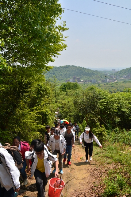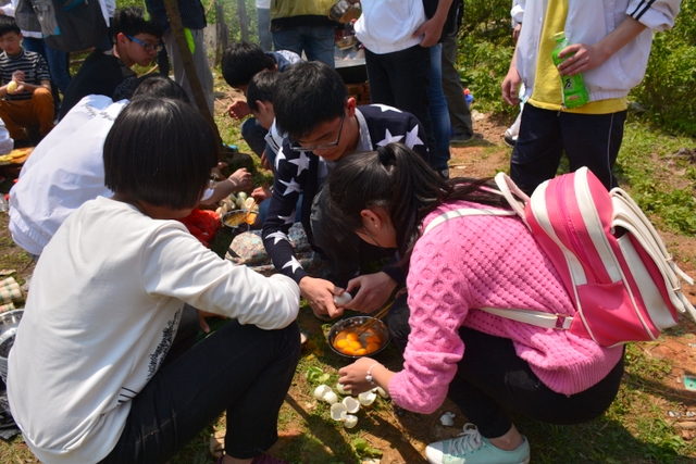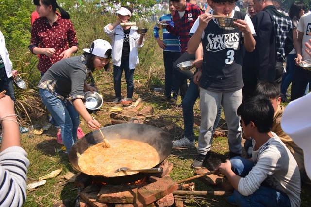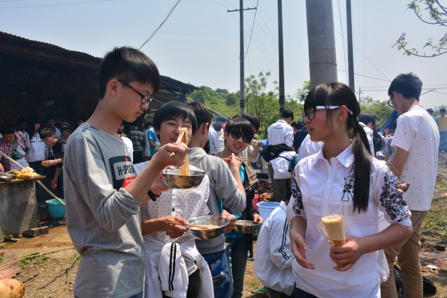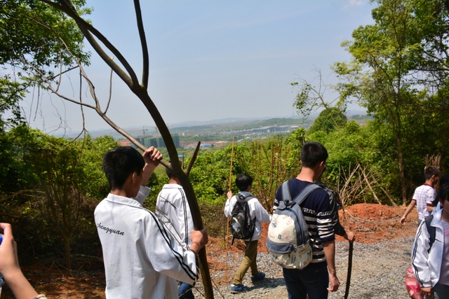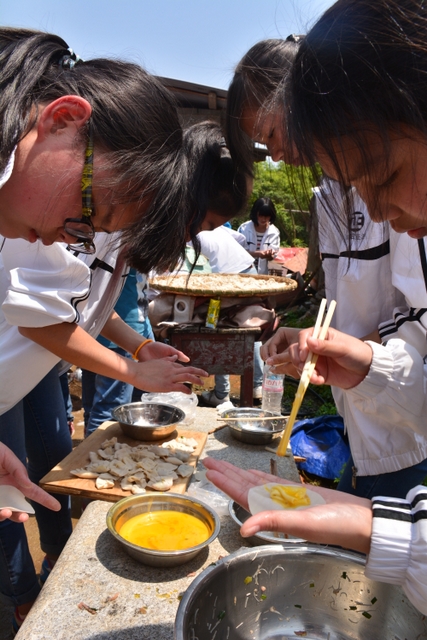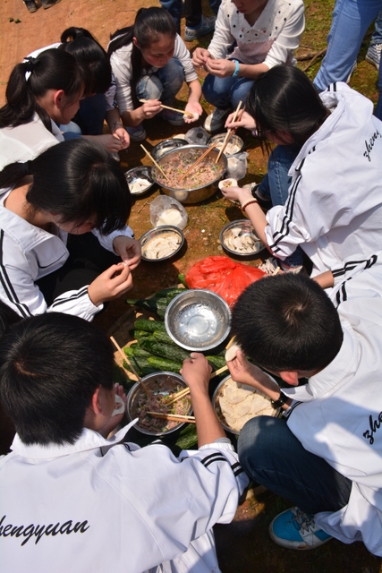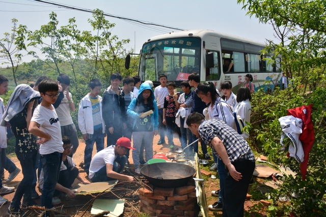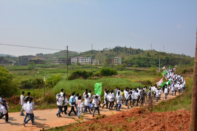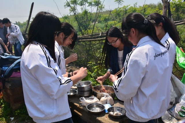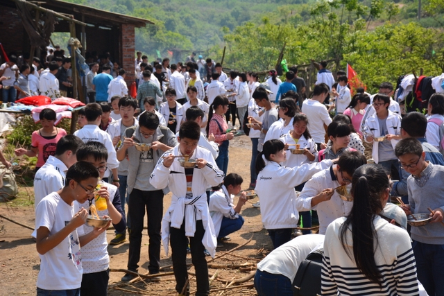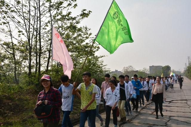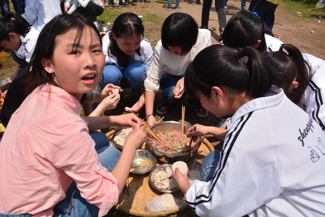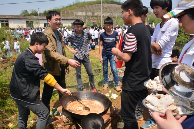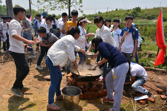 九点,一条白色的长龙沿工业大道蜿蜒前行。走出校园,同学们个个异常兴奋,一路上,歌声响彻云霄,口号声震天动地,引得沿途的村民都好奇地观望,许多车辆也停下来,车上人眼光里满是赞许。当队伍穿过107过道的时候,在学校保安和交警的指挥和引导下,过路的车辆都自觉地停下来为学生让道。队伍快速穿过国道进入三桥村,行进在乡村路上,呼吸着清新的泥土气息,看着村民们一栋栋崭新的楼房,乡村那片满眼的绿色让大家感觉心旷神怡。一路上,虽然不时有同学掉队,但在同学和老师的帮助和鼓励下,喝一口水,提一口气,抖擞抖擞精神,又跟上队伍继续前进了。三个多小时后,同学们终于到达目的地南岭仙山脚下,学校的生活车早已等在那里,同学们来不及喘一口气,就为中餐忙活开了:捡柴,搭灶,生火,洗涮,包饺子……按照分工,各司其职,现场一派忙碌的景象,学生个个忙得不亦乐乎。开餐的时间到了,场地上一片欢腾,品尝着自己亲手煮的面条,饺子,同学们吃得特别有味,一张张灿烂的笑脸就像太阳底下绽放的一朵朵太阳花。这欢腾,热闹,和谐的画面深深地印在每一个人的心里。