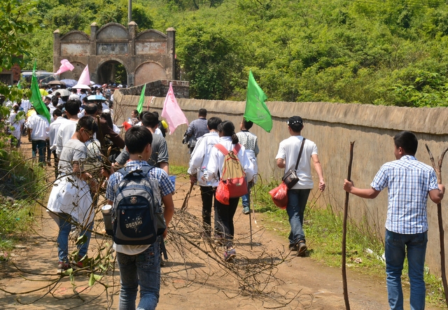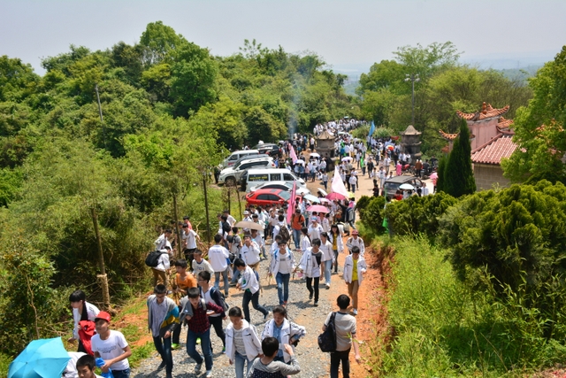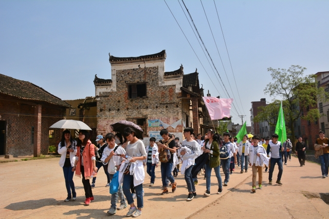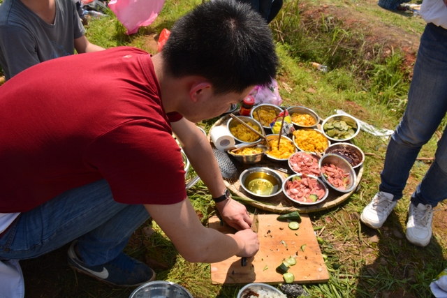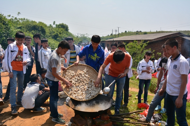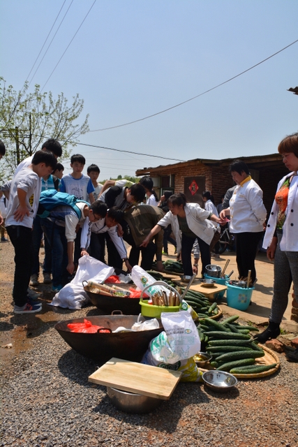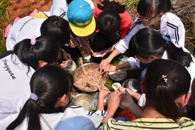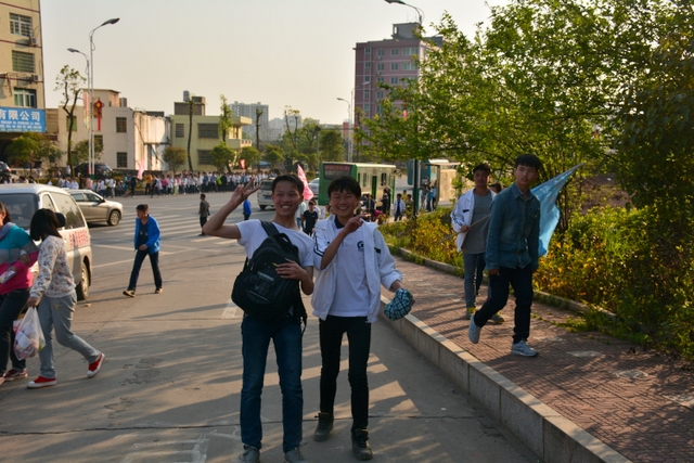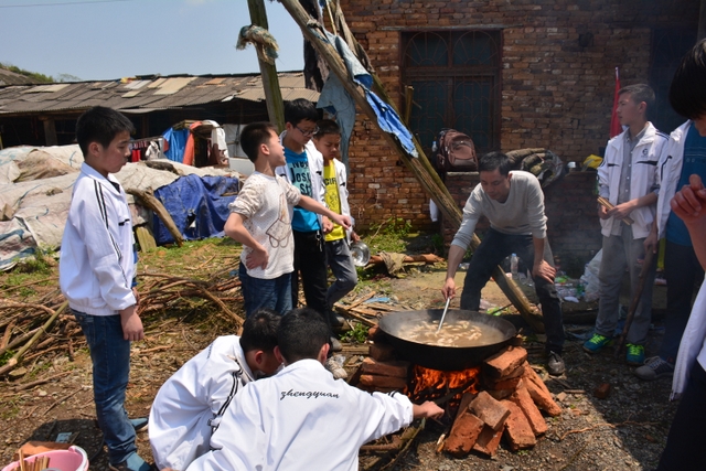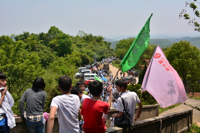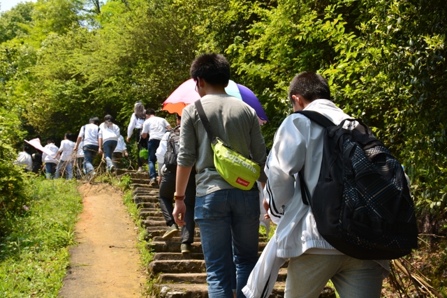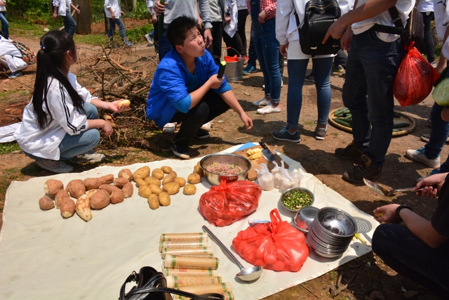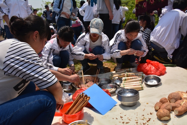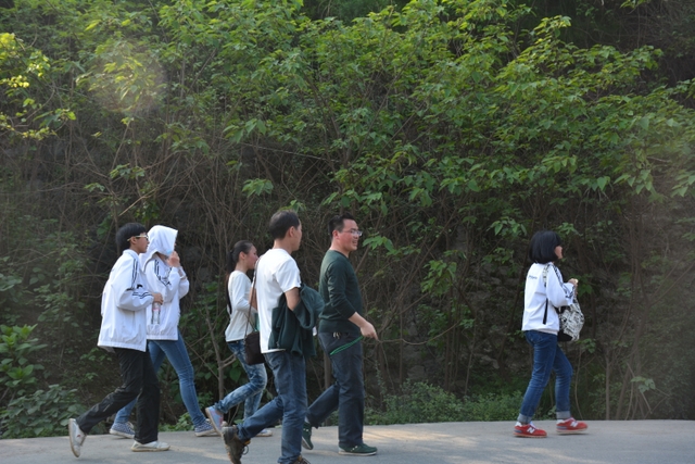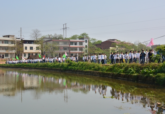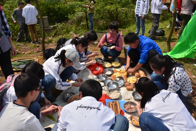 九点,一条白色的长龙沿工业大道蜿蜒前行。走出校园,同学们个个异常兴奋,一路上,歌声响彻云霄,口号声震天动地,引得沿途的村民都好奇地观望,许多车辆也停下来,车上人眼光里满是赞许。当队伍穿过107过道的时候,在学校保安和交警的指挥和引导下,过路的车辆都自觉地停下来为学生让道。队伍快速穿过国道进入三桥村,行进在乡村路上,呼吸着清新的泥土气息,看着村民们一栋栋崭新的楼房,乡村那片满眼的绿色让大家感觉心旷神怡。一路上,虽然不时有同学掉队,但在同学和老师的帮助和鼓励下,喝一口水,提一口气,抖擞抖擞精神,又跟上队伍继续前进了。三个多小时后,同学们终于到达目的地南岭仙山脚下,学校的生活车早已等在那里,同学们来不及喘一口气,就为中餐忙活开了:捡柴,搭灶,生火,洗涮,包饺子……按照分工,各司其职,现场一派忙碌的景象,学生个个忙得不亦乐乎。开餐的时间到了,场地上一片欢腾,品尝着自己亲手煮的面条,饺子,同学们吃得特别有味,一张张灿烂的笑脸就像太阳底下绽放的一朵朵太阳花。这欢腾,热闹,和谐的画面深深地印在每一个人的心里。