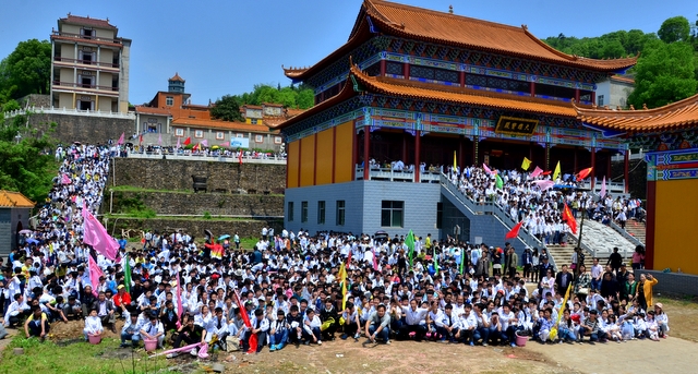 远足队伍从山的南面登山,好多班级的同学们是自发的唱着歌,喊着号子行进在上山的路上,真有点像电影中革命队伍的大行军,让人心潮澎湃,热血沸腾。中午时分,大家到达半山腰的鹿峰寺。在大雄宝殿前面,全体远足人员拍了一张合影照。