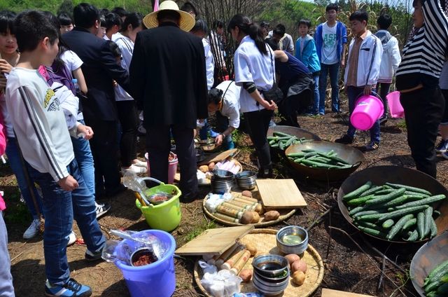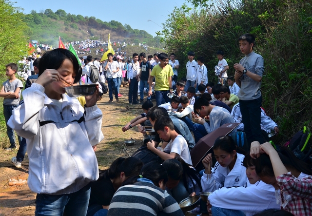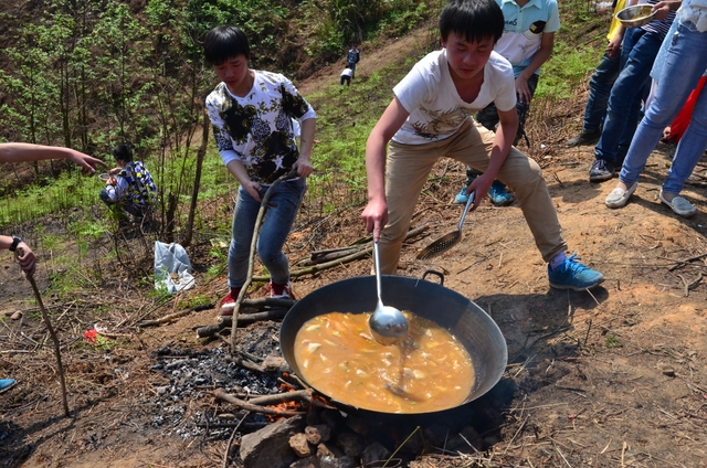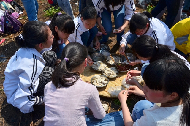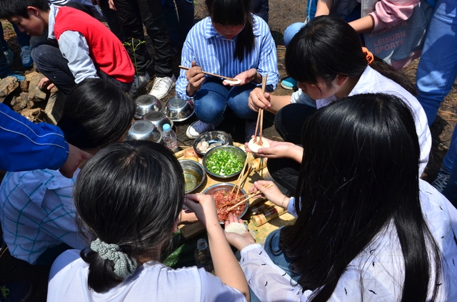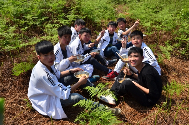 按事前采点,由学生自己埋锅造饭的中餐选择在顶峰西面的一个没有草木的荒山坡上。同学们对于自己动手搞生活兴致很高,打柴的,垒灶的,生火的,包饺子的,削土豆的,切黄瓜的,下面条的,忙得不亦乐乎。那些班主任,不管是老成持重的,还是初出茅庐的,都吆喝着,比划着,一头的汗水,带头操持着自己的一大家子生活。吃着自己亲手做的饭菜,那真是一个香啊!由于组织有力,从后勤保障到安全保卫,各方面都做足了准备,此次远足秩序井然,受到沿途群众的交口称赞。