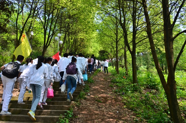 9时许,队伍以二路纵队的形式从学校浩浩荡荡出发,宛如一条白色长龙。计划中的远足路线与上次初一年级的路线一样,从鹿峰南面上山,从鹿峰西面下山过钢便桥返回,全程约50华里。按预定计划,队伍在位于群英路边的蔡伦纪念园稍作停留,参观这个全国闻名的爱国主义教育基地,让同学们感受祖国灿烂悠久的文明,潜移默化加深对伟大祖国的热爱。很多班都在公园里拍了集体照,定格中学时光美好的一刻。