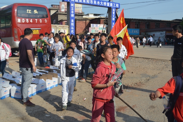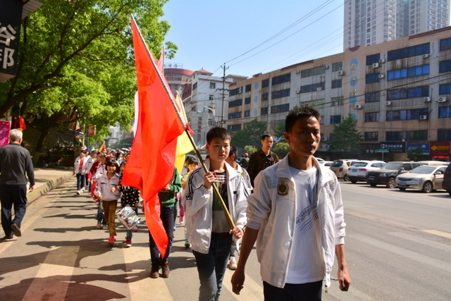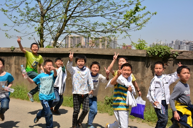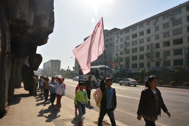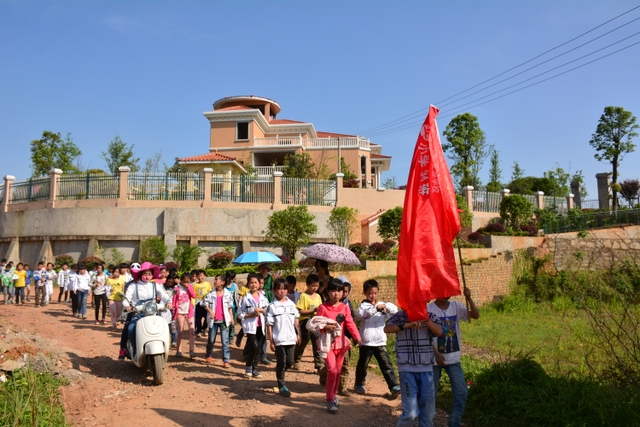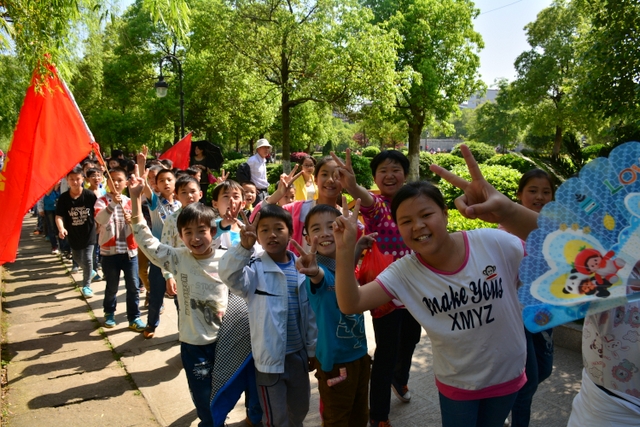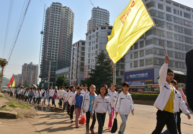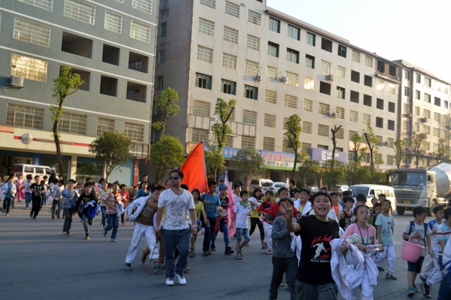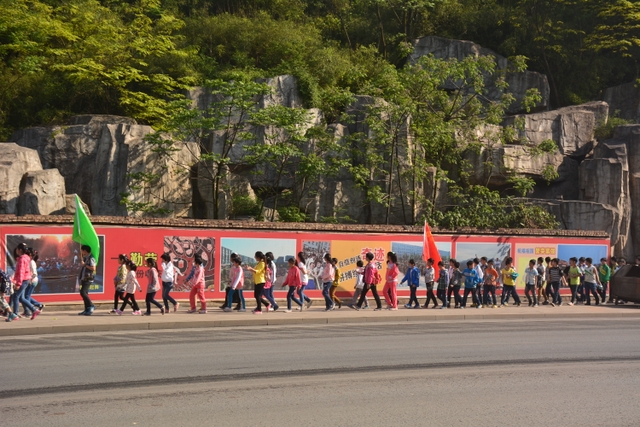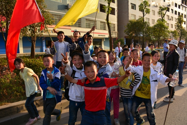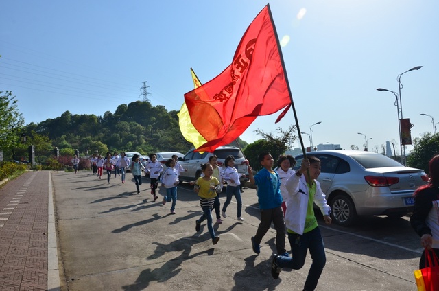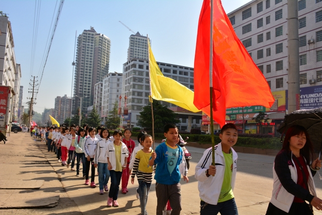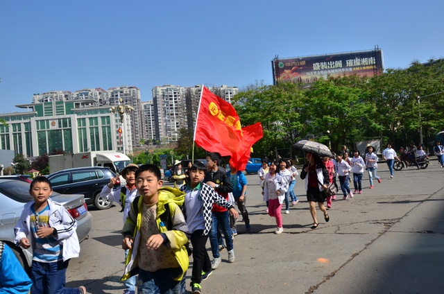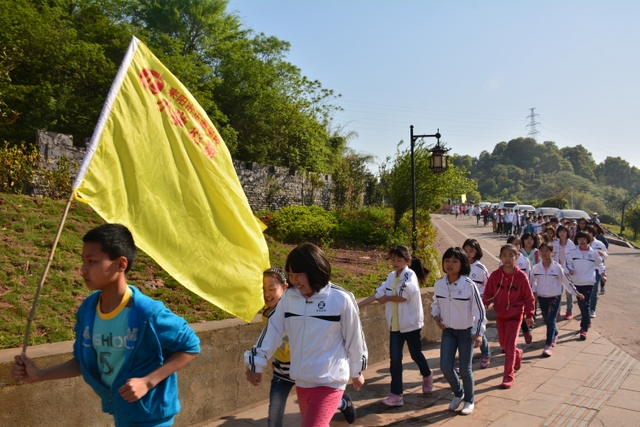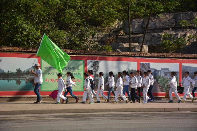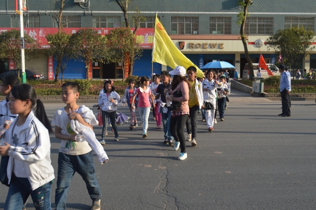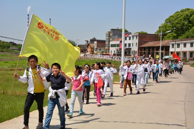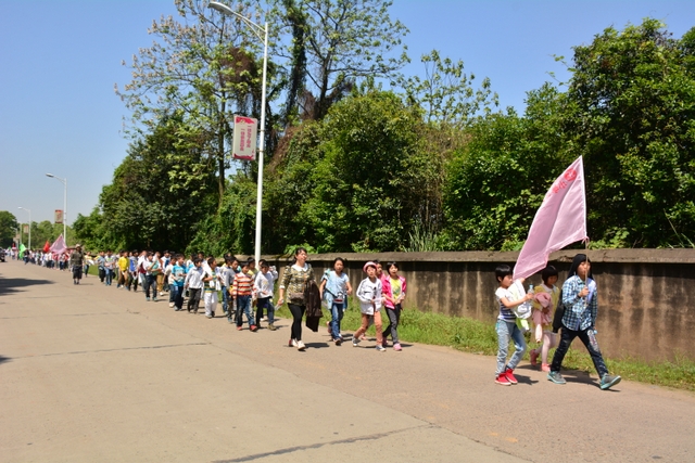 早上八点,五年级的全体师生在学校大广场整队集合,年级主任王巧云主持了远足动员大会,罗湘云校长做了动员讲话,强调了活动目的、意义和要求,周运根主任强调了此次远足的纪律。年级主任王巧云郑重宣布:五年级全体同学远足开始!整个年级排成长长的队伍,都以班级为单位两路纵队排开,队伍有序地走出了校门,一路上,学生们意气风发,朝气蓬勃,一路欢歌,一路笑语,整个队伍像一条长龙蜿蜒前行在宽阔的马路上。