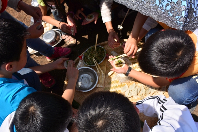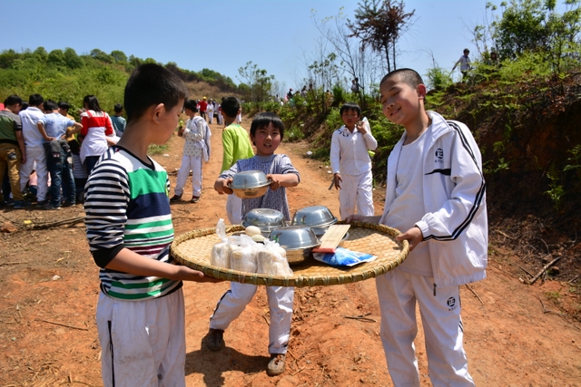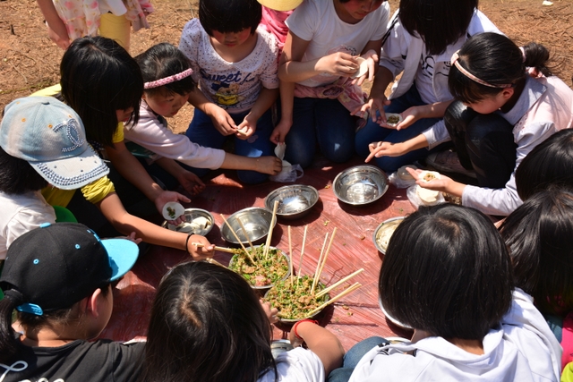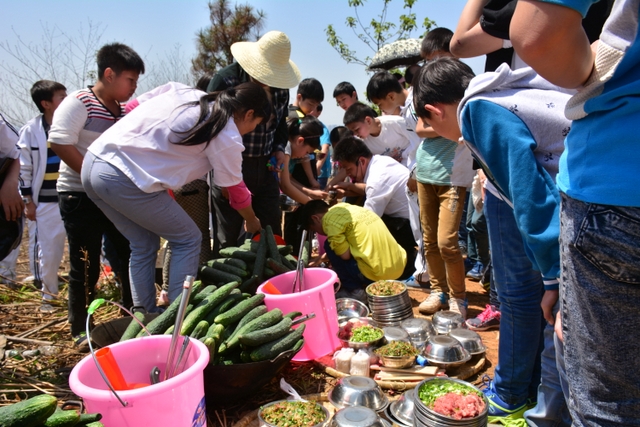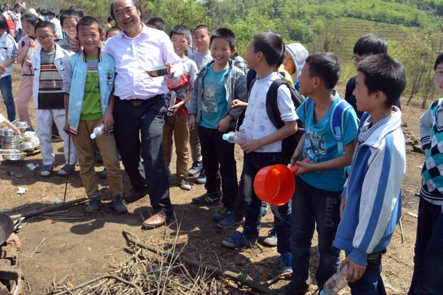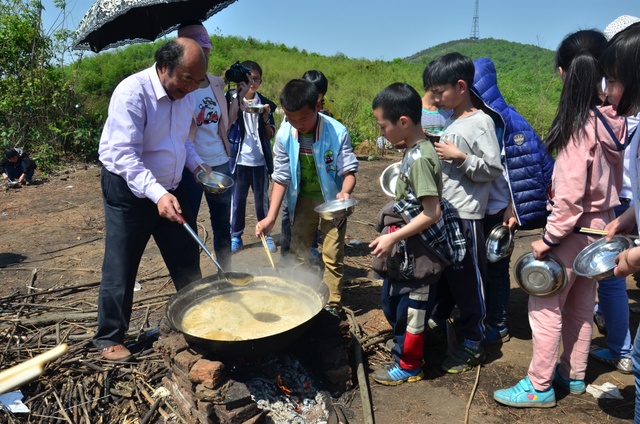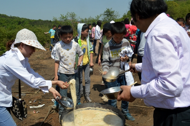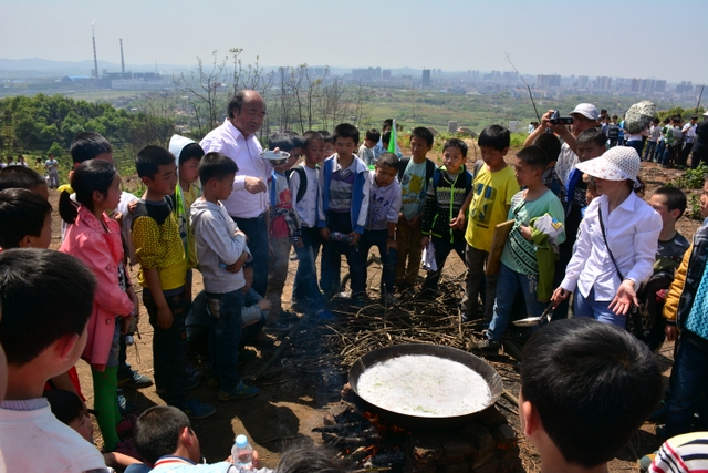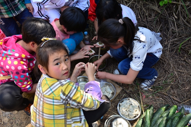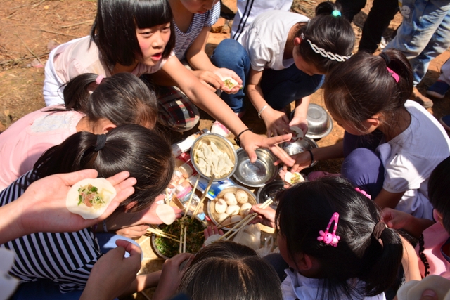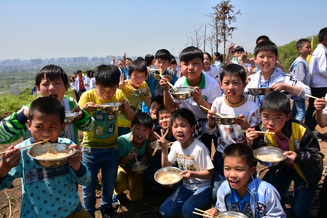 经过将近3个小时的行程,同学们来到了鹿岐峰半山腰的大雄宝殿,在这里,我们整个五年级的全体师生拍了年级大合影,按照事先安排好的野炊地点,同学们更加兴奋,一个个摩拳擦掌,准备在野炊中展现自己。到达野炊地点,学校的生活车早就在那里等候。同学们来不及喘一口气,就为中餐忙活开了:捡柴,搭灶,生火,洗涮,包饺子……按照分工,各司其职,现场一派忙碌的景象,学生个个忙得不亦乐乎。罗湘云校长看到这一幕,也被学生深深的感染了,亲自下厨,和91班的学生一起煮起了面条。吃着和校长一起煮的面条,学生的脸上洋溢着幸福的笑容。其他班级的同学看到校长了,都热情邀请校长去尝尝自己班级煮的面条和饺子。现场其乐融融。
