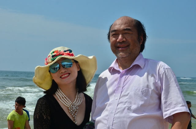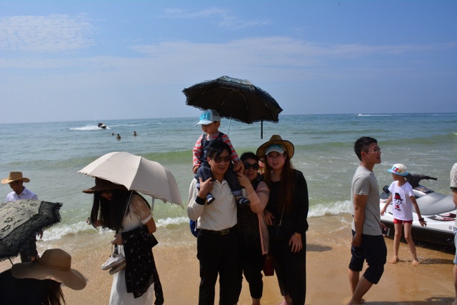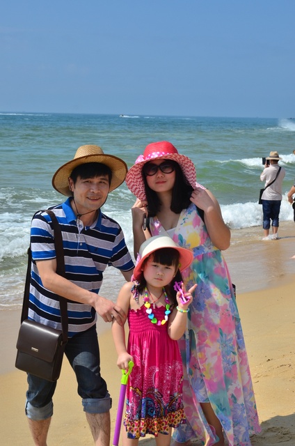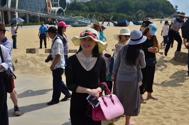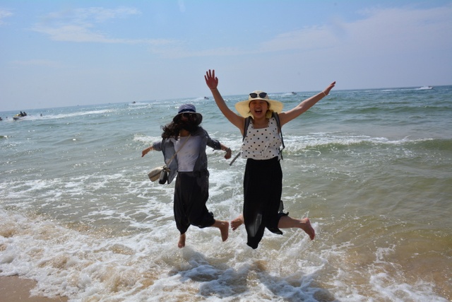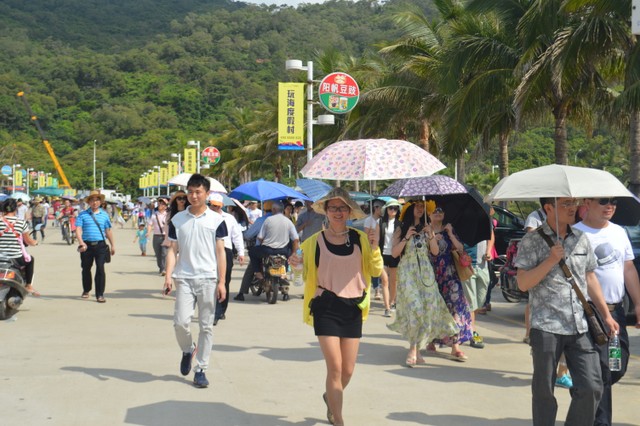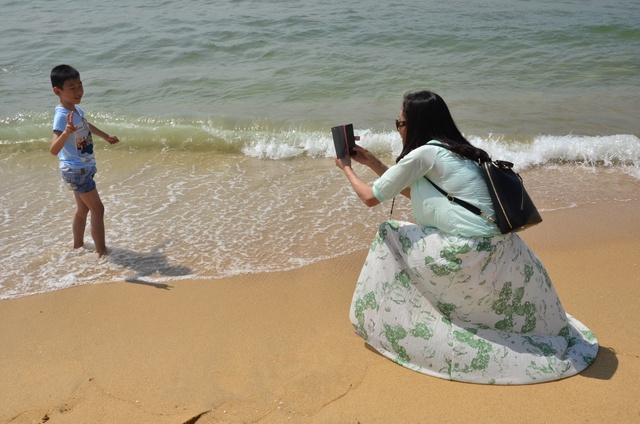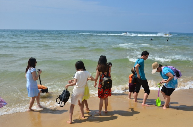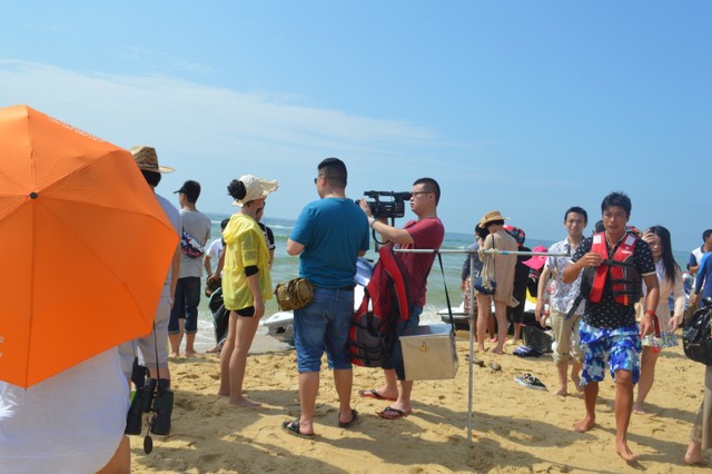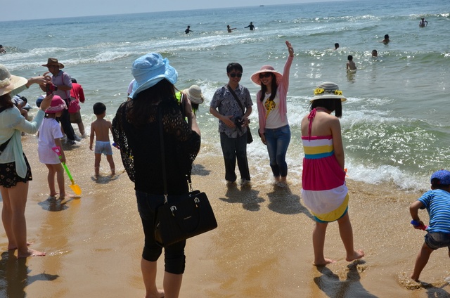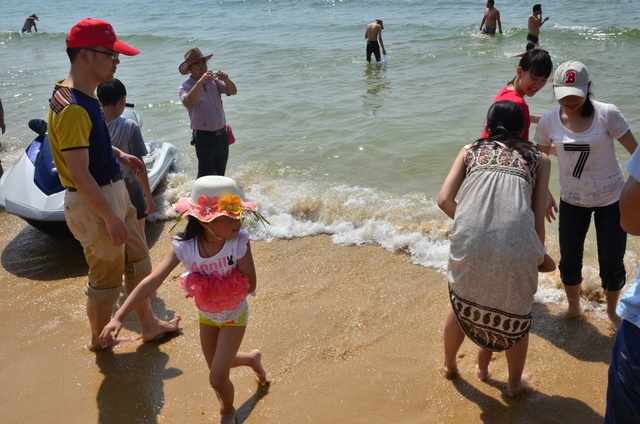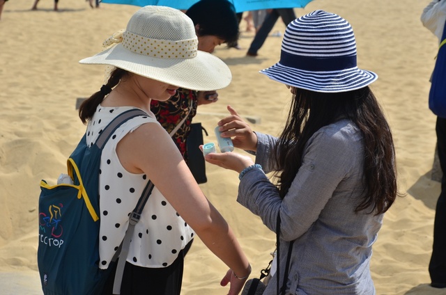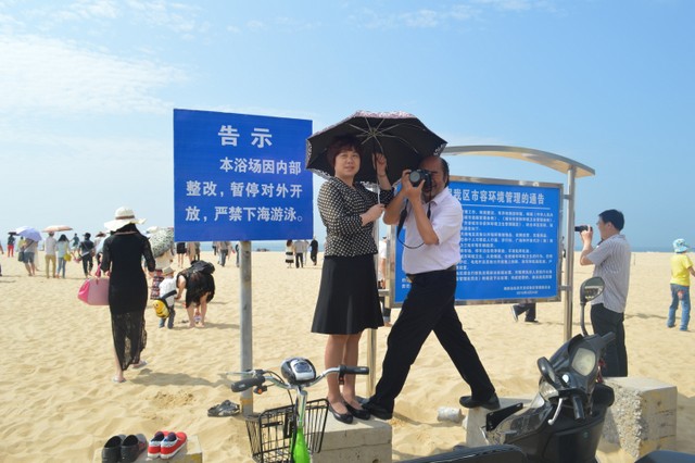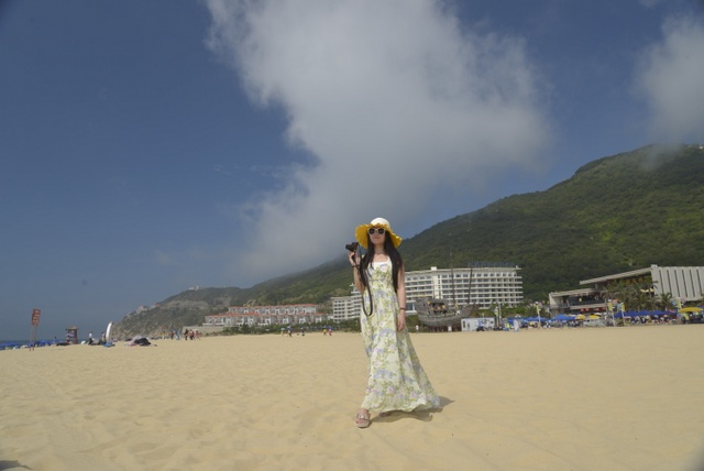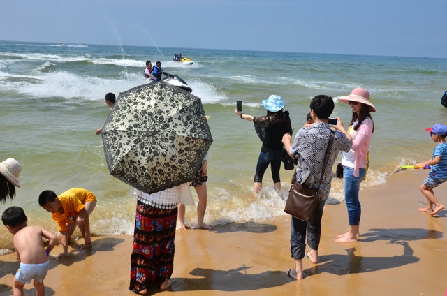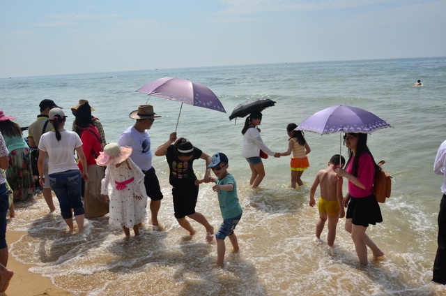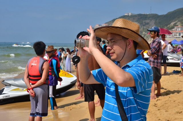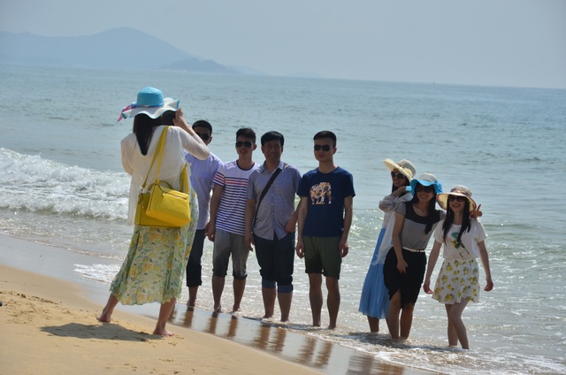 看到沙滩下面一片湛蓝的大海,有个别游泳好手光着膀子就扑进了海里,让人敬佩;老成的跃跃欲试,打听坐摩托艇的各种信息,想坐上去冲一次,又不想第一个吃螃蟹;大部分人还是在水边,摆出各种造型,让同事拍照。有的跳起来,喊着“大海,我来了!”有的做着剪刀手,“耶!耶!”的尖叫。有的女孩子从小贩那里买来“照相花”别在头发上,偏着头照相,像极了那个杨二什么娜的。还有一个女孩子举着自拍棒对着自己旁若无人的拍了又看,看了又拍,比张艺谋还精益求精。