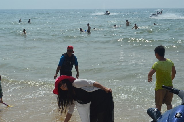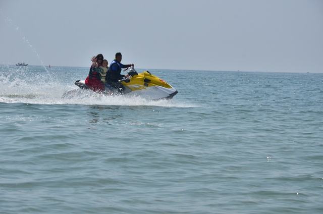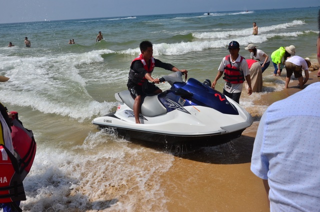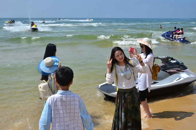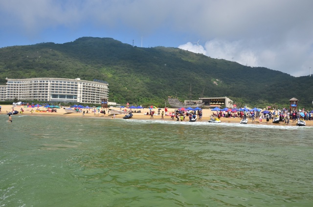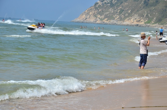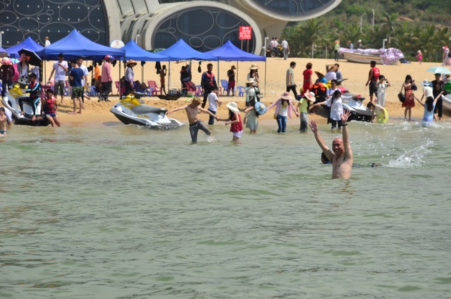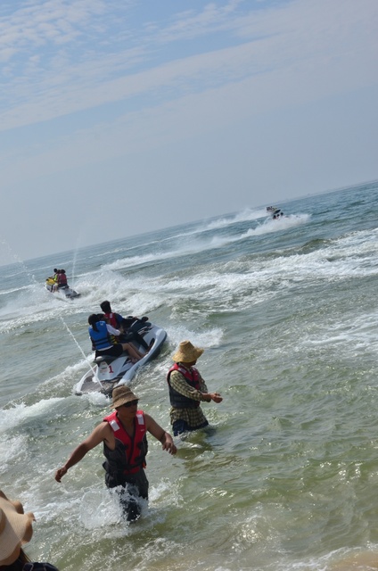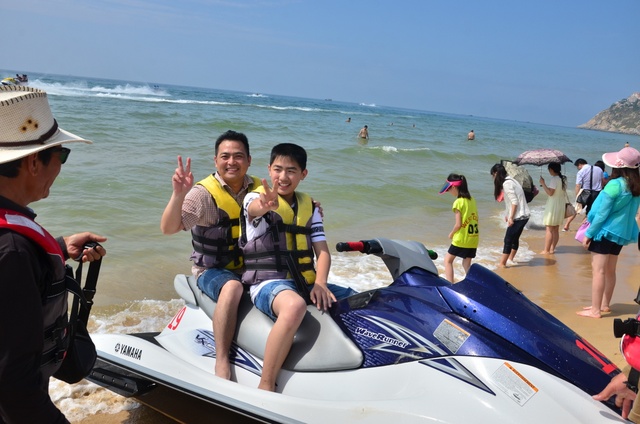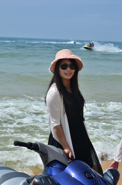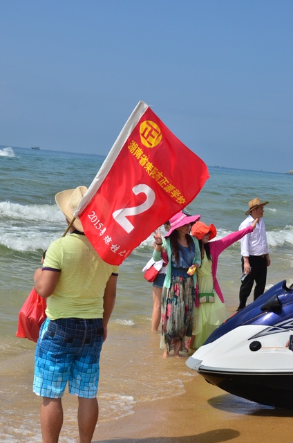 在那些摩托艇主人开着艇在面前海域呜呜的飙来飙去的引诱下,终于有胆大的男老师坐了上去,冲出去几十米,转几个圈就回到岸边的沙滩。不过代价不菲,坐一次一百大毛呢。看看也没什么凶险,更多的人加入了坐摩托艇的行列。