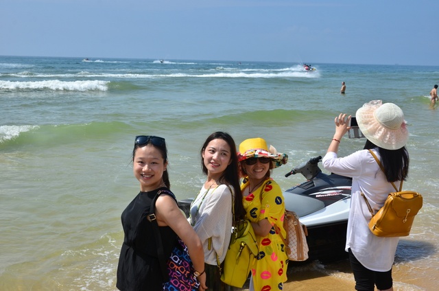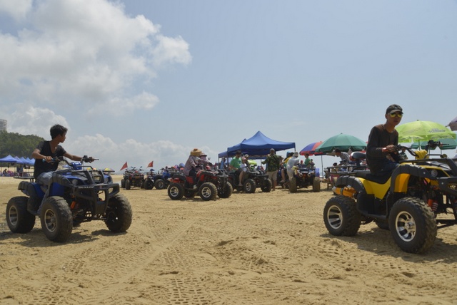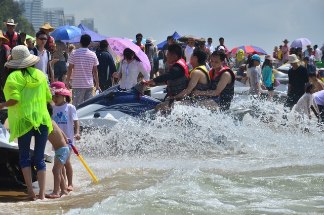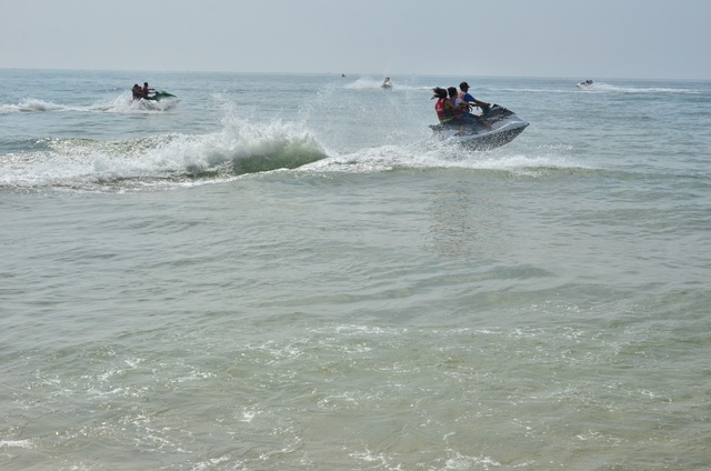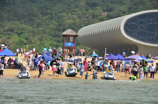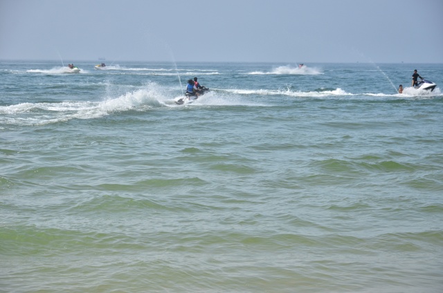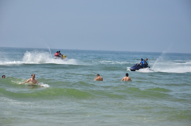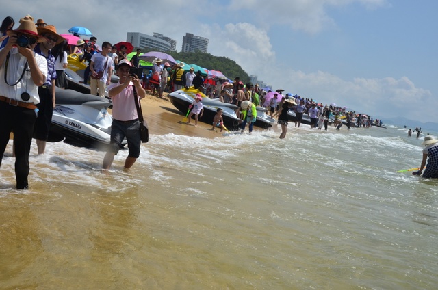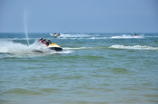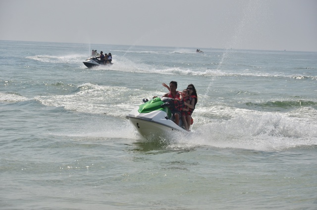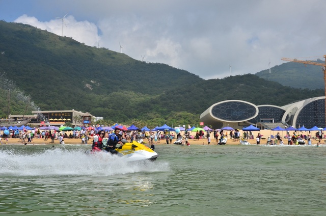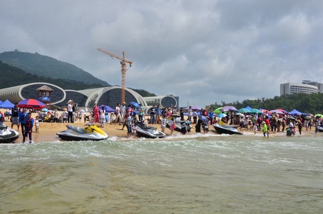 在那些摩托艇主人开着艇在面前海域呜呜的飙来飙去的引诱下,终于有胆大的男老师坐了上去,冲出去几十米,转几个圈就回到岸边的沙滩。不过代价不菲,坐一次一百大毛呢。看看也没什么凶险,更多的人加入了坐摩托艇的行列。