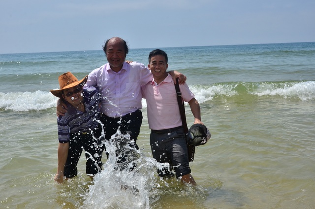 也有胆小的,怎么也不敢下海,身上挂满了去冲浪同事的手机、包包、墨镜、太阳帽等物件,虽然辛苦,但笑得比海里的人还响亮。这部分人占大多数,他们很多赤足站在滚烫的沙子上,有脚气的,幻想着治脚气,有风湿的幻想着治风湿,是不是真的有用只有天晓得,但都有所谓的专家的话作依据。他们像一群啦啦队,为在海里的同事呐喊着欢笑着,拍着各种镜头。
