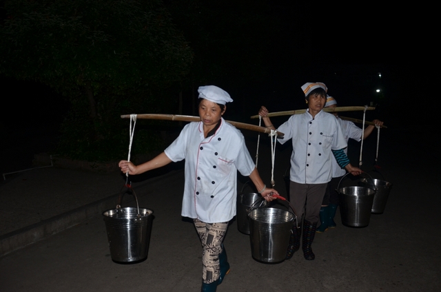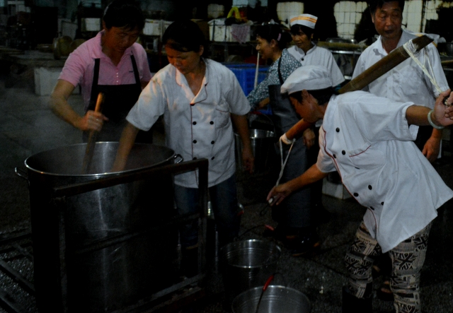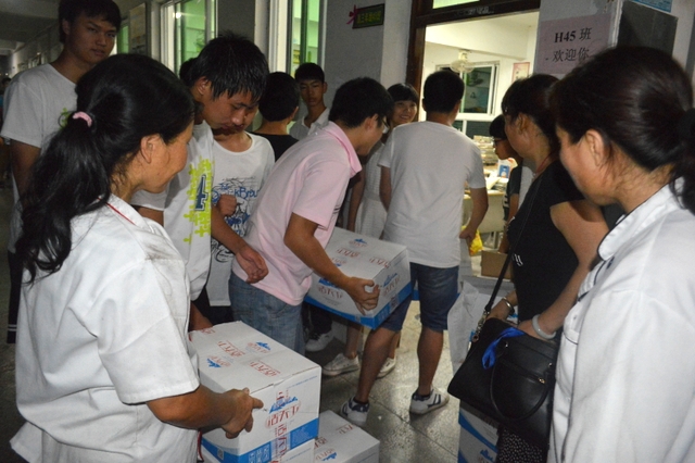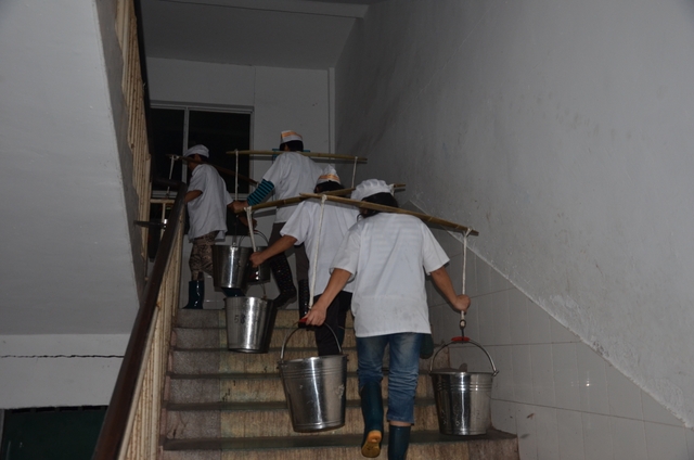 食堂的操作间,给学生的夜宵——绿豆稀饭已备好,工人师傅正一担担挑往各个高三教室。一箱箱纯净水也被悄悄送到各班。见到一个满脸大汗的大嫂,吃力起抱起两箱水从一楼去往四楼,脚步轻轻的,问她什么心情,她说,我孩子也是今年的高考生,我是做了一个母亲能做的,心里高兴。