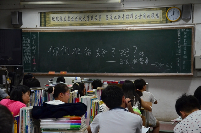 高三教室,灯火辉煌。教室后面堆满了一摞一摞的做过的习题纸,每个课桌上是高高的教材教辅,一切如从前一样。学生们都在埋头看书写字,安静得我们不忍心拍照。是的,我们相机的闪光虽然是从学生背面过去的,但绝对破坏了这一份温馨的宁静。可爱的孩子们,为了明天的念想,请原谅我们的片刻打扰。