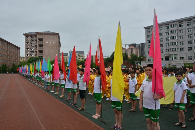 开幕式于早上8:28分准时开始。首先入场的是国旗队、校旗队,紧跟在后面的是彩旗队、花环队、龙狮队、吉他队、篮球队、竹笛队、武术队,接下来是各年级代表队入场,最后是学前班的小朋友手拿气球欢呼而过。