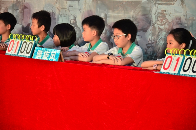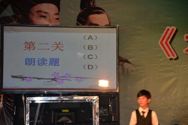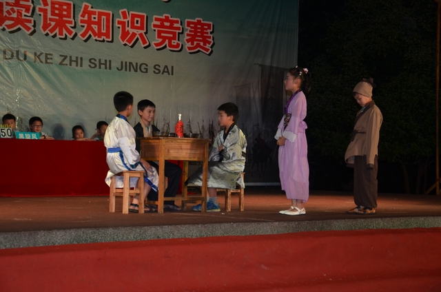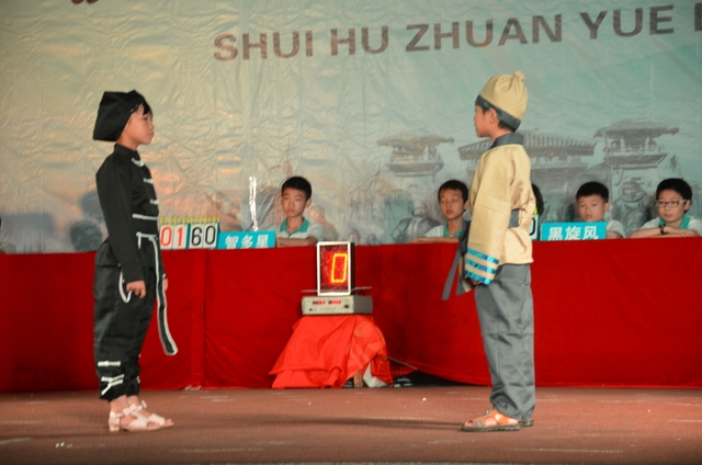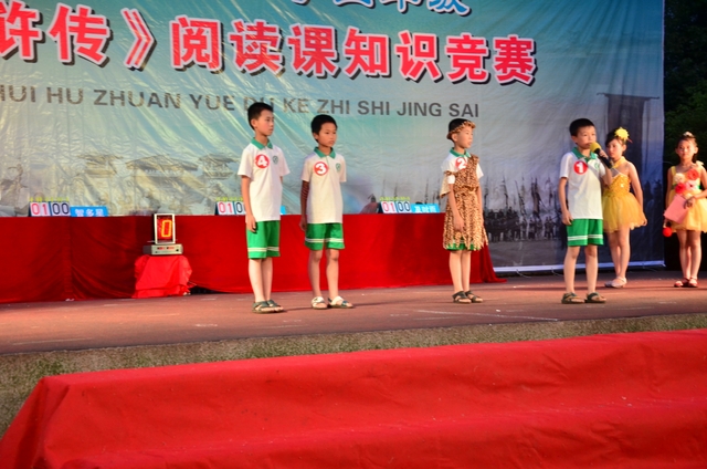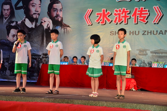 雄浑激昂的音乐声中,红旗舞动,在慷慨豪迈的大型朗诵《水浒传奇》中,活动拉开了序幕。在6位小主持人深情地介绍下,四个方队的16位小选手,均身着洁白的校服,佩戴号牌入场,个个精神饱满、志在必得。本次竞赛主要包括必答题、朗诵题、抢答题、风险题四个环节,中间穿插有学生自编自演的紧扣“水浒”内容的文艺表演。经过激烈的角逐,玉麒麟队荣获第一名,智多星队获得第二名,黑旋风队和及时雨队均获得第三名。