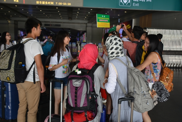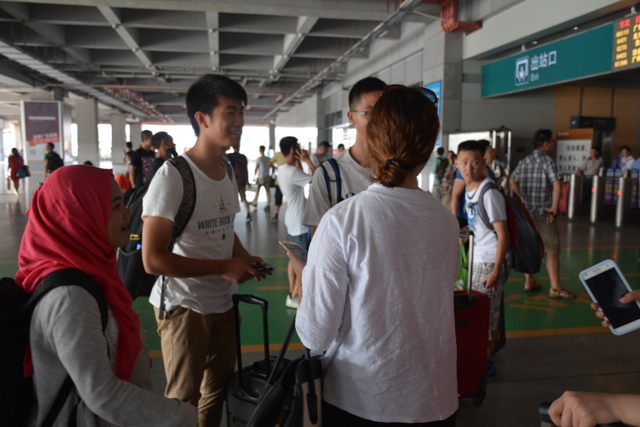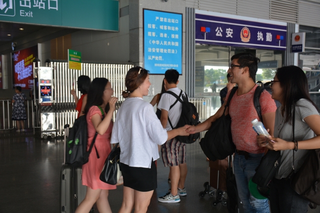 志愿者在出站口与正源学校负责夏令营活动的刘老师握手