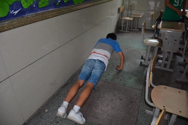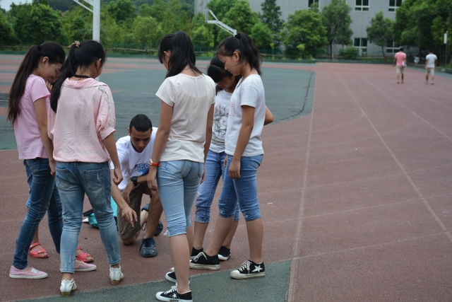 第一步,Amir老师向学生抛一个乒乓球,接到球的学生用英语作自我介绍,若学生未接到球,则要站到讲台上做自我介绍,并接受“惩罚”,如唱歌、跳舞、做俯卧撑等。这一自我介绍的方式,让学生大胆的用英语说话。这些学生基本上是在正源读小学的,英语底子好,用英语面对外国人作简单的自我介绍,不是难事,加上现场又有中国老师的帮衬鼓励,更是说得兴趣盎然,一个比一个流畅。