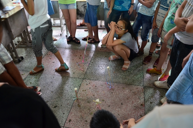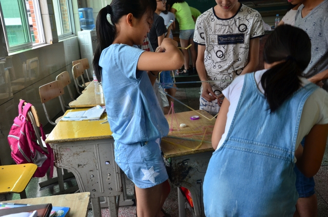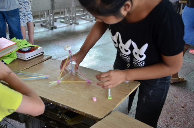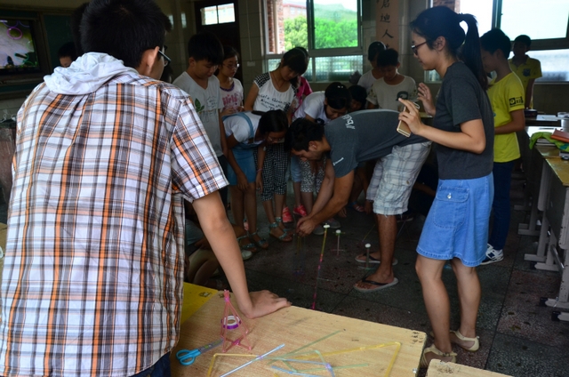 他们首先给孩子们讲述了这两个词的含义,分别是想象与创造。之后,为了鼓励孩子们开拓思维,大胆创造,他们带着孩子们做了一个游戏:孩子们被分成五个小组,每个小组将得到30根吸管,一把剪刀,一卷胶带和一颗棉花糖。孩子们被要求要在15分钟之内用这些东西打出一个最高的建筑,并能够在最高点放上一颗棉花糖。