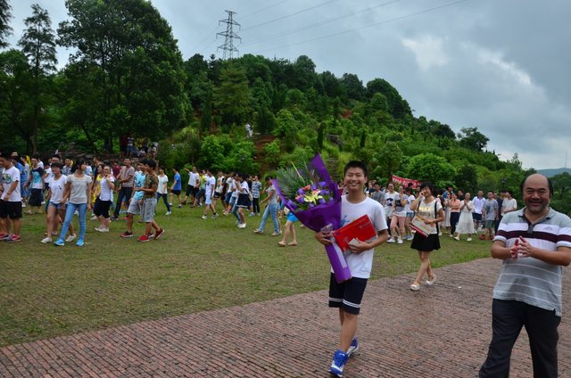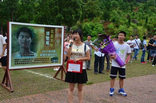 南操场正中间,欢迎的学生留出了一条“星光大道”,刚领了通知书的同学缓缓走了进来,又迎来媒体的新一轮长枪短炮,特别是谭智威同学,绝对是今日的明星!欢迎的学生中传来一阵阵整齐的声音:“谭智威,你最棒,你是我们的好榜样!”在学弟学妹们敬佩的目光中,谭智威、谢卓、刘雪琪等同学作了简短的发言。他们都认为是正源这一方风水宝地培养了他们,是正源的“2+4”使他们人生有了更高的平台。一向很能说的罗校长,可能太激动了,今日只讲了短短几句话:谭智威是个留守儿童,他四岁时,父母就去浙江打工了,今天这样热闹的日子也没有回来;我们正源五个考起清华北大的,有四个是留守儿童;考一个清华北大生可能是运气,但四年上了五个清华北大生就不是偶然的!