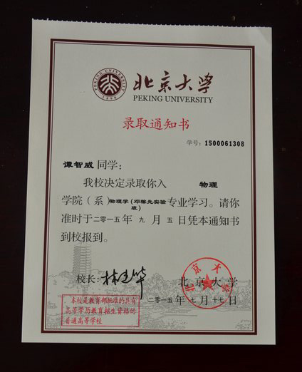 谭智威同学是我校今年应届毕业的理科生,以675分夺得了耒阳市理科状元,被北京大学物理学邓稼先实验班录取。谭智威同学是继潘军、刘凡犁、廖文奇、刘礼杰之后第五个考入清华北大的我校“2+4”应届毕业生。除谭智威同学外,今年我校有近20人考入了中国科学院大学、武汉大学、中山大学、华中科技大学等中国一流名校,继续书写着正源高考神话。为了庆祝我校四年内五人考入清华北大,激励正源学子奋发向上,学校决定举行一个隆重的仪式,迎接高考录取通知书的到来。