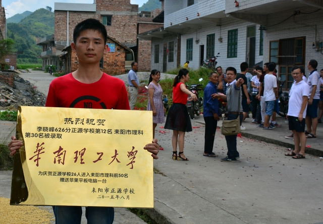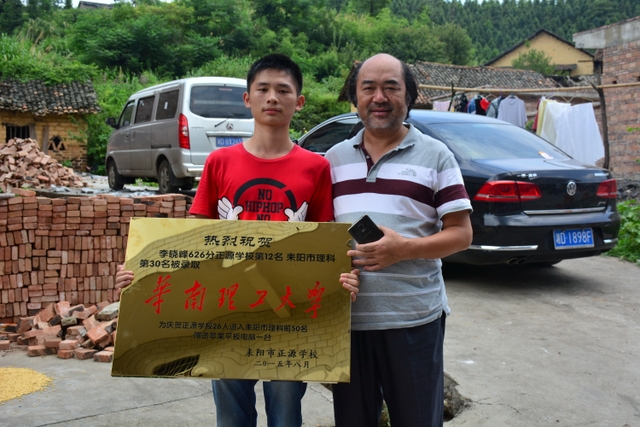 今年高考以626分排名正源学校理科第十二名、耒阳市理科第三十名的高44班学生李晓峰被华南理工大学录取。
