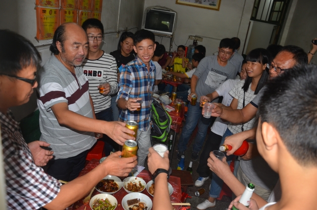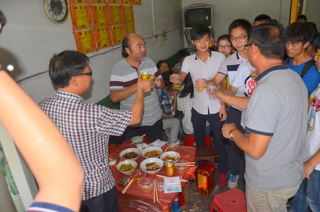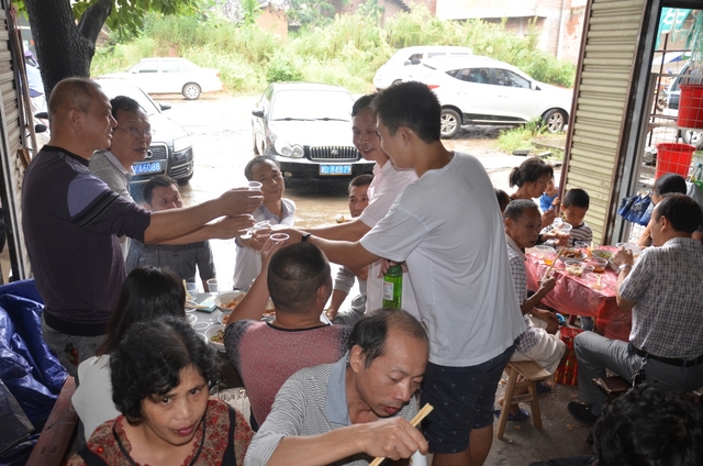 梁先辉父子向正源学校校长、老师、同学敬酒。