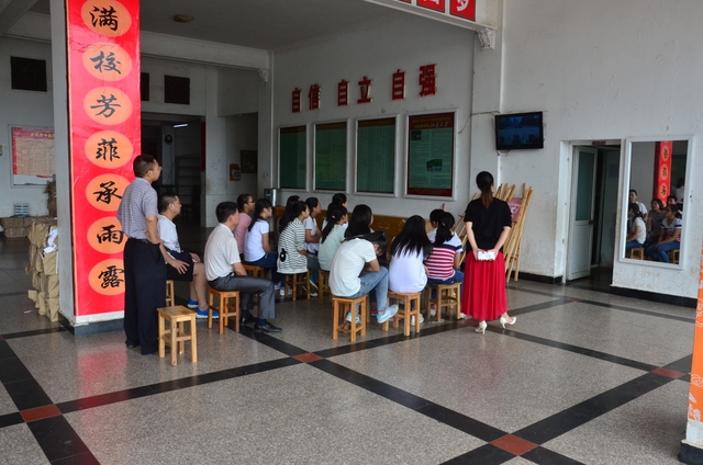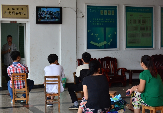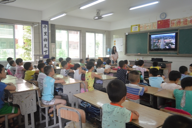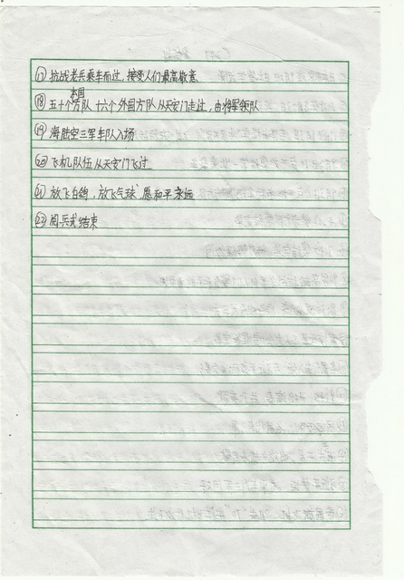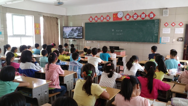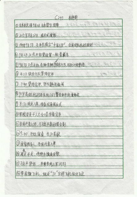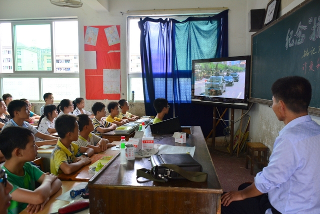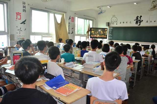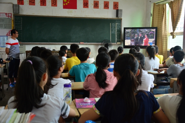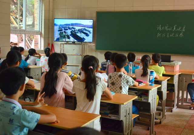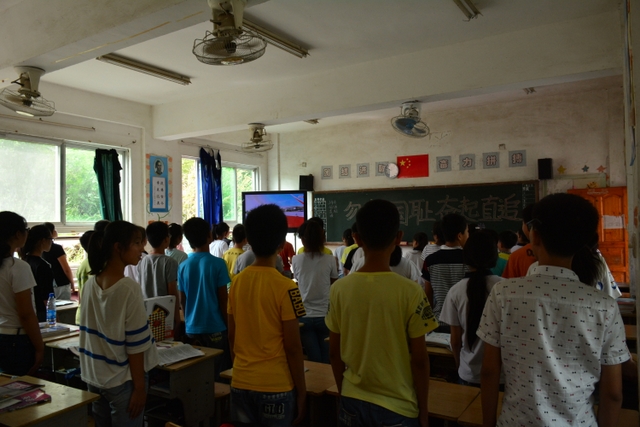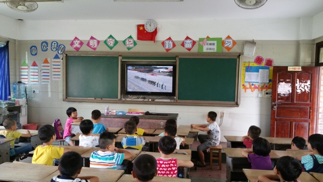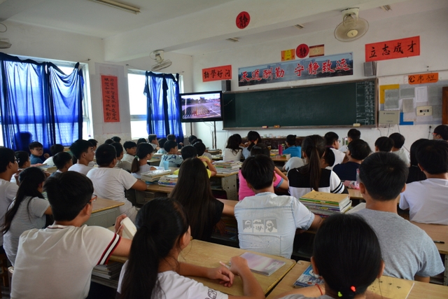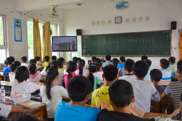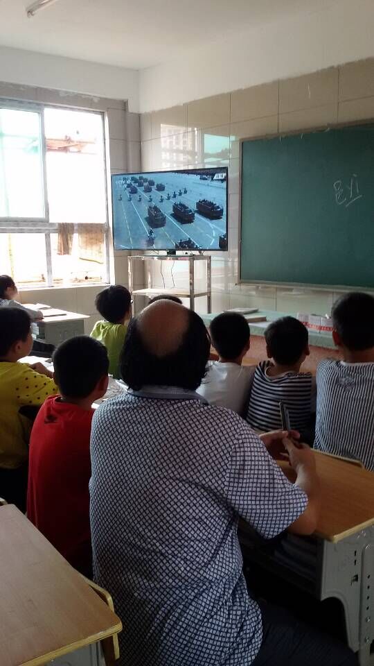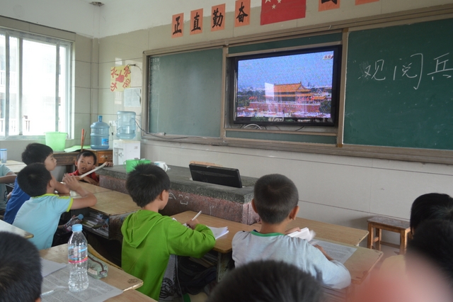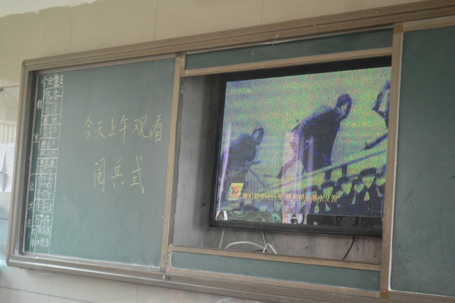 早餐过后,还没有到上第一节课的时间,各班就调好了电视,在黑板上写下“勿忘国耻 振兴中华” “珍爱和平 远离战争 展我军姿 扬我国威” “铭记历史 缅怀先烈 珍爱和平 开创未来” “纪念抗日战争胜利70周年”等标语,有的班还在黑板上写出了记好笔记、看完直播后写观后感的要求。