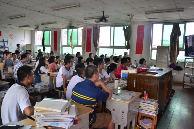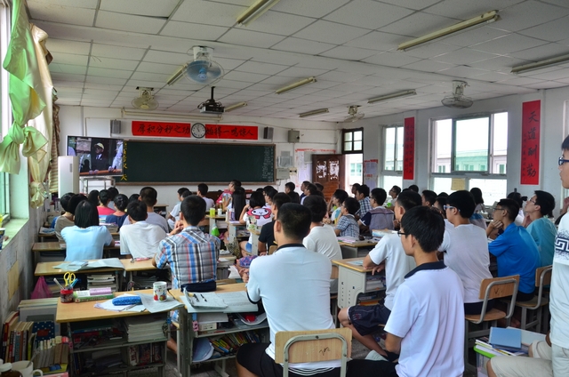 同学们陆陆续续走进各自的教室,兴致勃勃、聚精会神地开始观看直播,边看边做笔记。罗校长也走进教室,一面观看直播,一面用手机拍下同学们认真观看直播的动人画面。