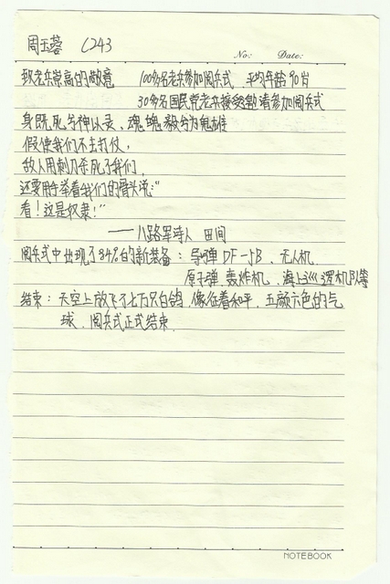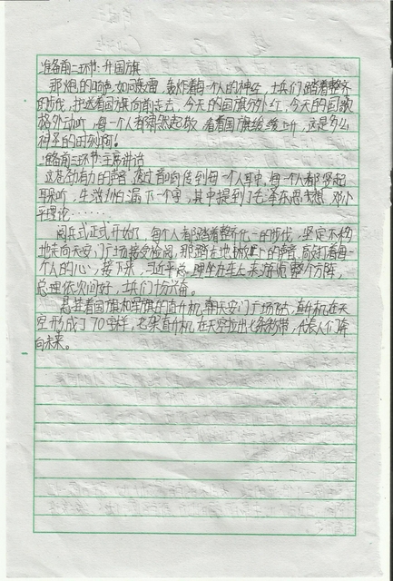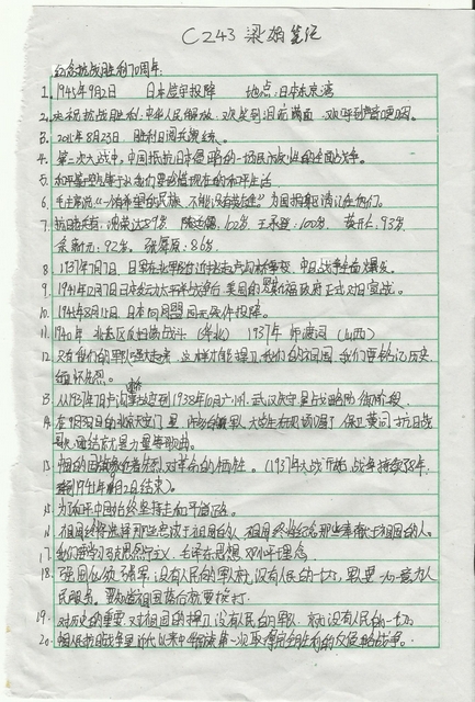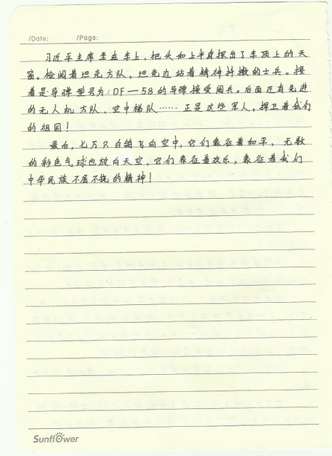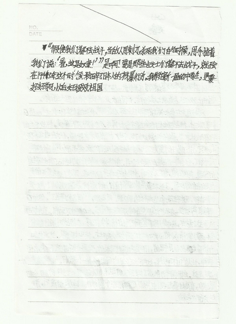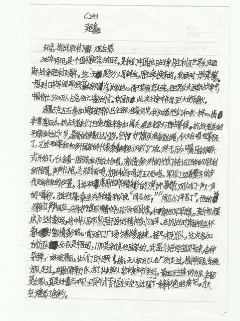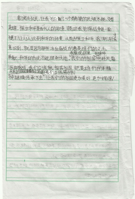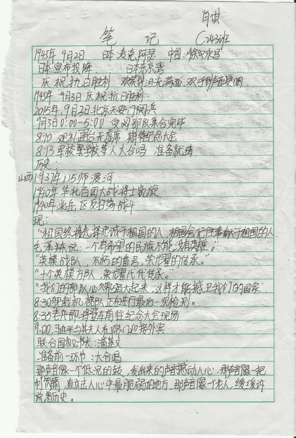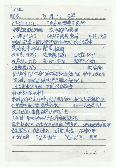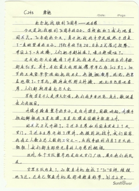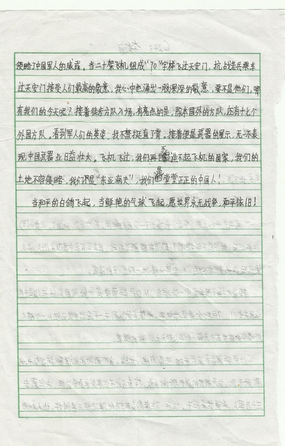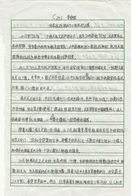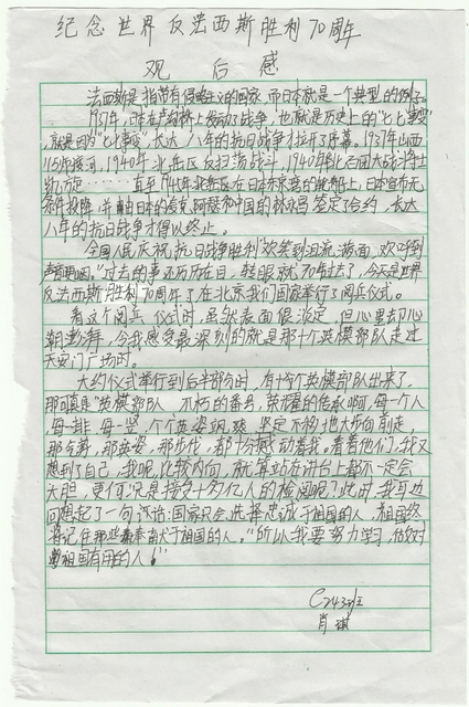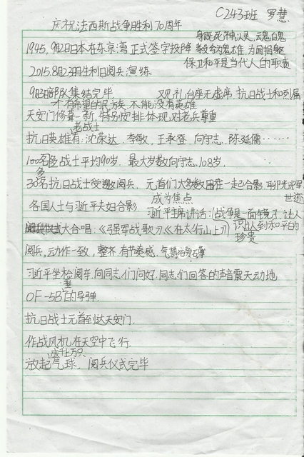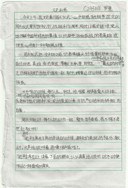 初一年级C243班段曙红老师组织同学们认真观看,仔细思考,写好观后感。李舒莉同学在观后感中写道:阅兵式开始之前,电视台先播出了一些历史瞬间。虽然早就知道了,但看到悲壮的场面,我还是不禁哽咽了,眼泪在眼眶里打转。日本军官在中国肆意伤人、杀人的画面仿佛就在眼前,心中不禁升腾起一股悲愤之情。伍辰欢同学写道,当时的战争背景,日中国力悬殊,但不能阻挡抗日将士英勇顽强、奋力抵抗的决心,没有他们的浴血奋战,就没有我们今天的幸福生活,也没有祖国今天的强大。看到一支支整齐的队伍,听到一声声响亮的口号……我的心中感到无比骄傲、自豪。罗慧同学写道:看了阅兵式,我明白了一个有希望的民族不能没有英雄。战争是一面镜子,让我们认识到了和平的珍贵。保卫和平是当代人的职责。我们应该好好学习,把英雄们的精神继续传承下去,让我们的祖国更加美好,更加辉煌!