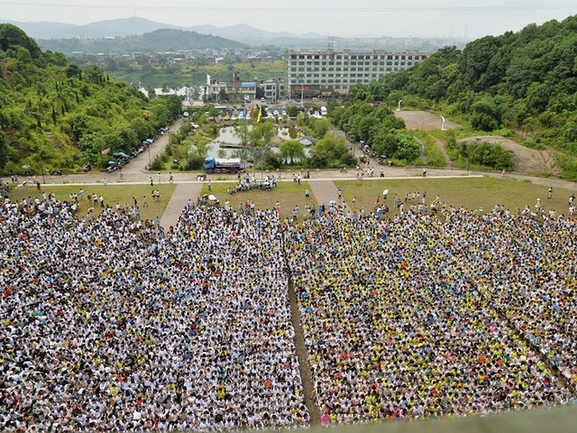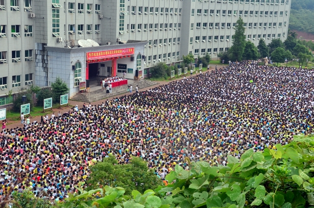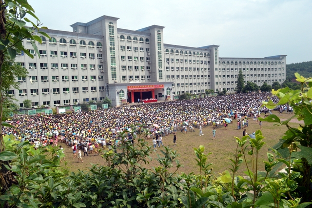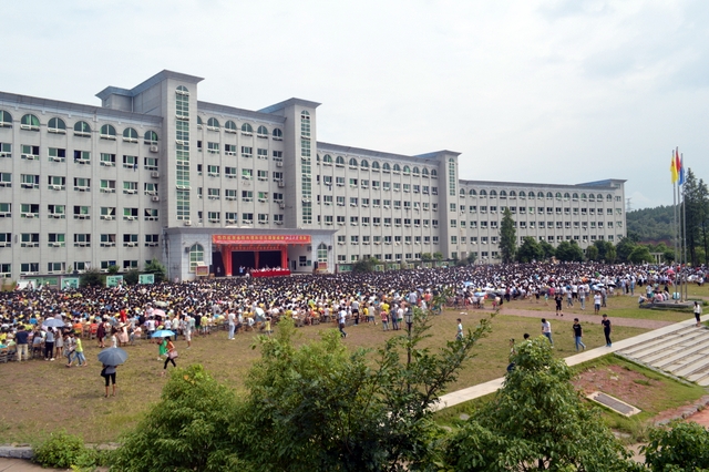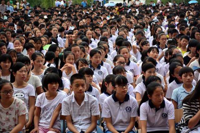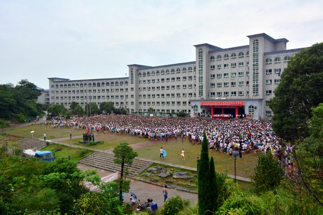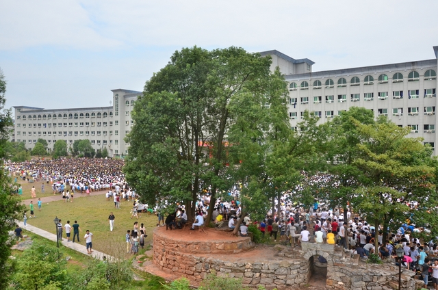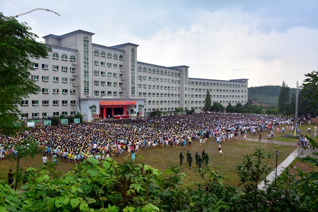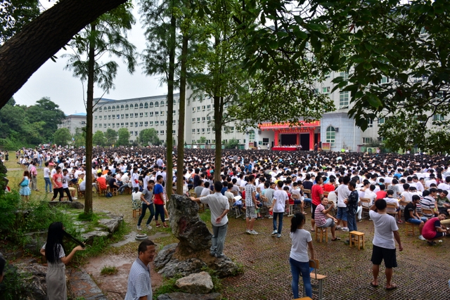 今天的广场,如同节日一般。教学楼大厅上方“热烈祝贺耒阳市理科状元谭智威同学被北京大学录取”的横幅特别耀眼,十盏大红灯笼鲜艳夺目。八点刚过,嘹亮的音乐声通过学校广播及时响起,各学部、各班级同学陆陆续续有序进入学校广场。