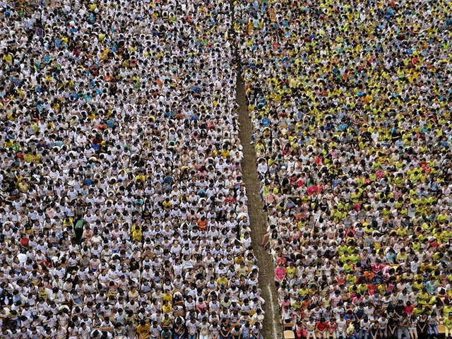 随即举行升国旗仪式。国旗班八名女生身着迷彩服,英姿飒爽,步履铿锵,和着激昂的音乐,迈着整齐的步伐,走向国旗台。国歌响起,15000余名师生向国旗行注目礼,少先队员行队礼,一面鲜艳的五星红旗和两面蓝、黄色校旗冉冉升起,七彩礼花呼啸着冲向云天,一挂二十米长的鞭炮响彻大地。