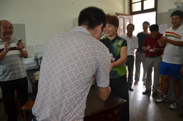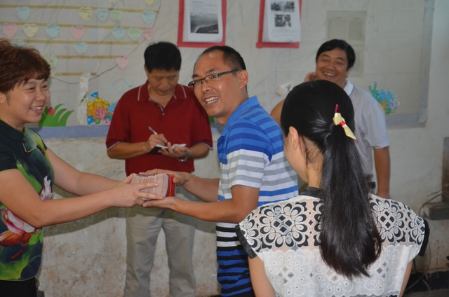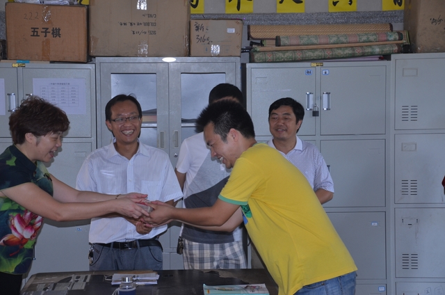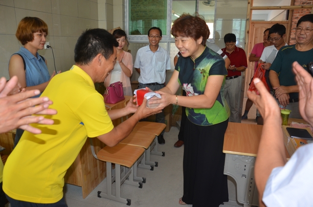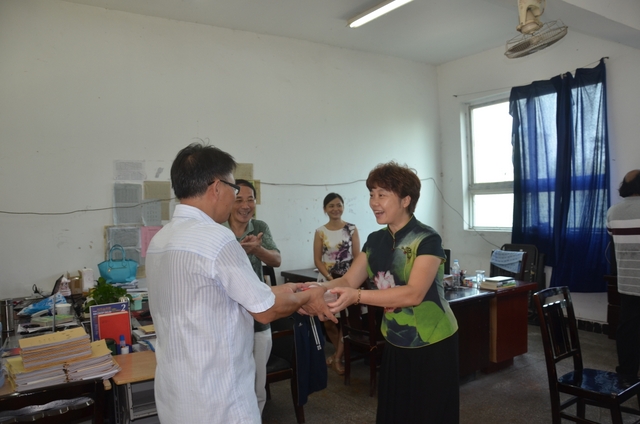 初二年级主任唐循南(右)从梁总监手中接过慰问金