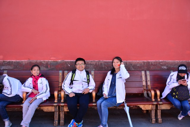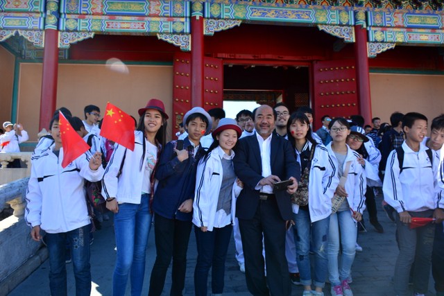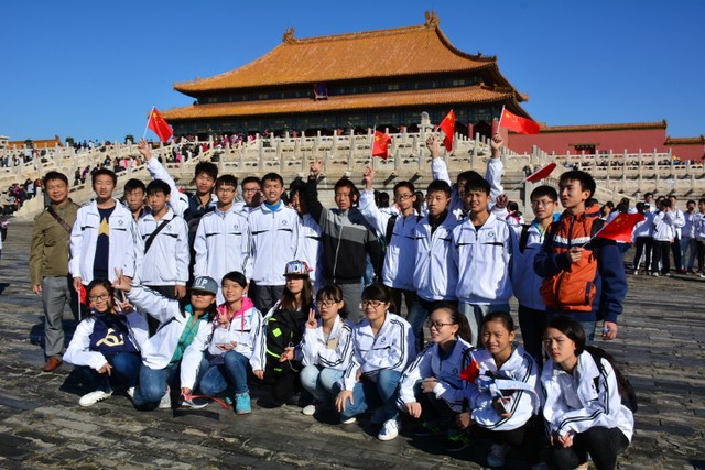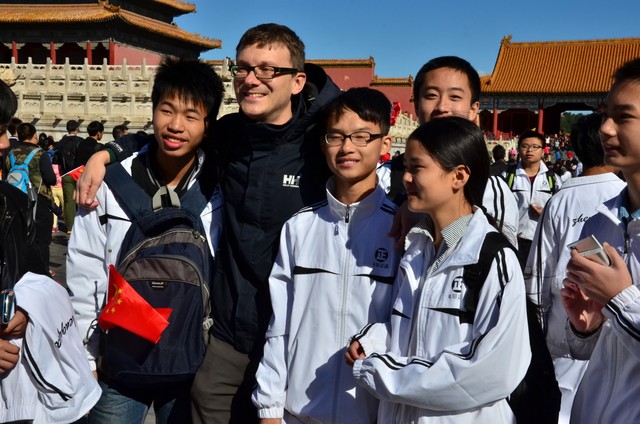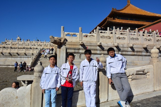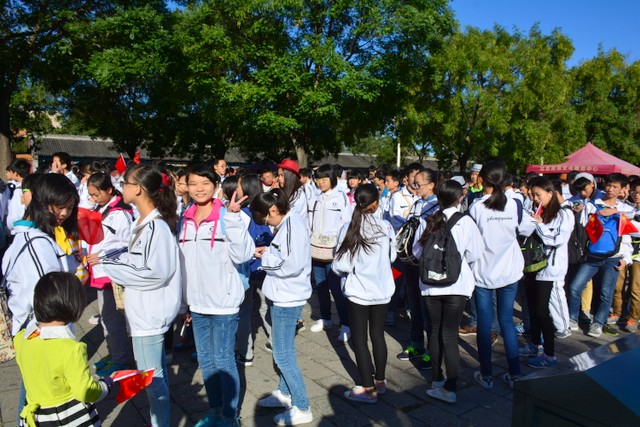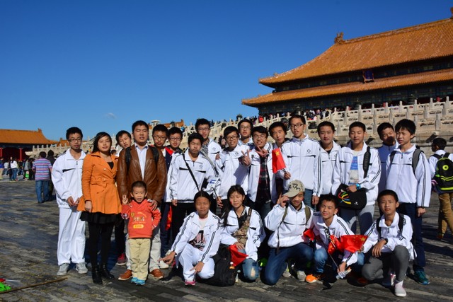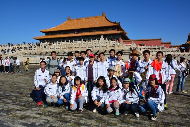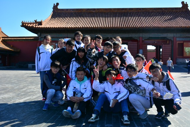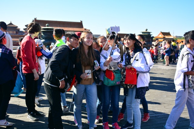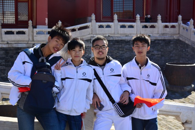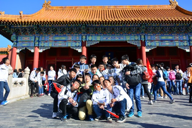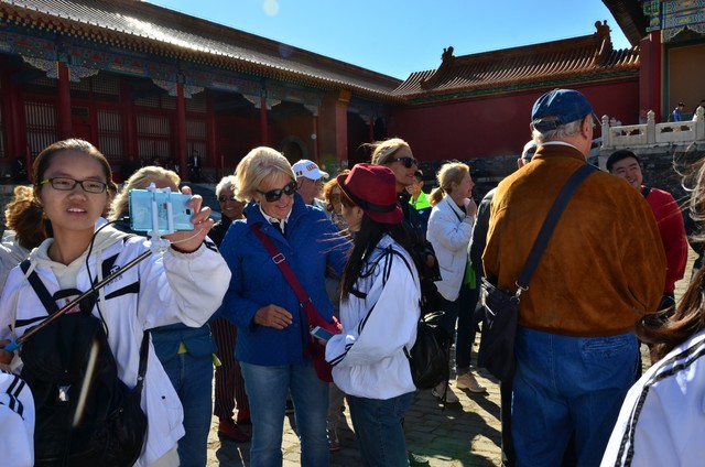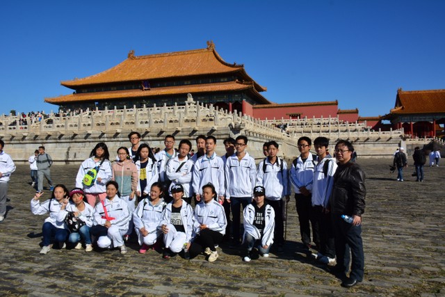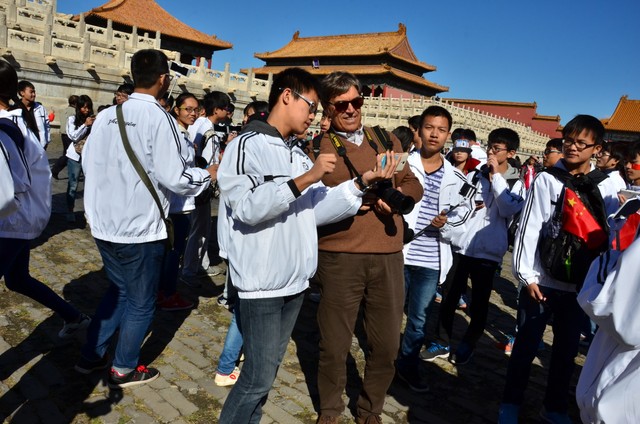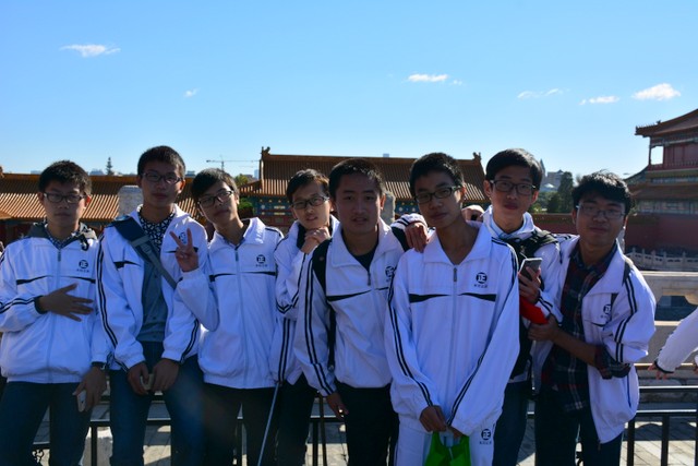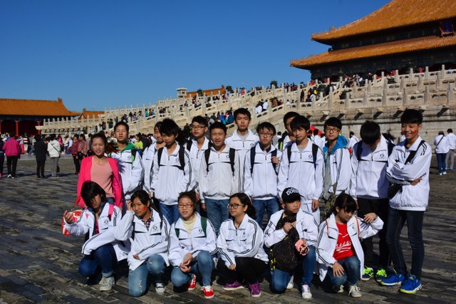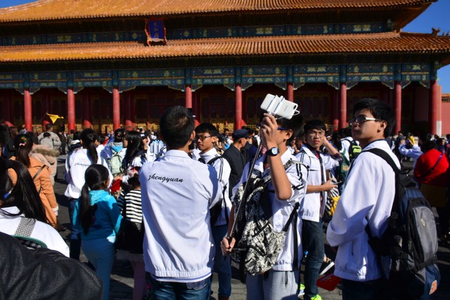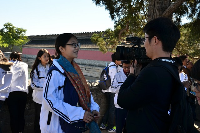 记者在故宫采访正源学生。好像这个姑娘已经在火车上接受过一回采访了。