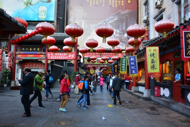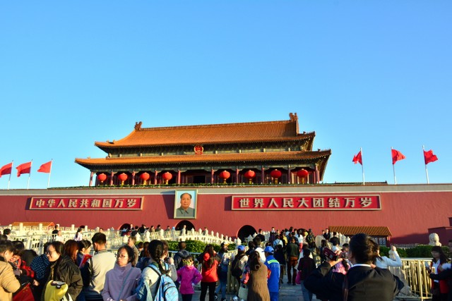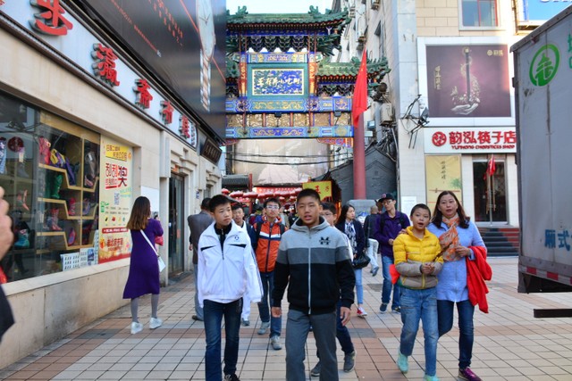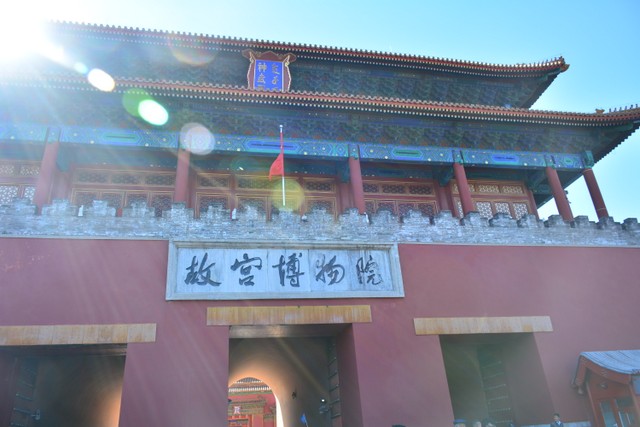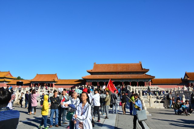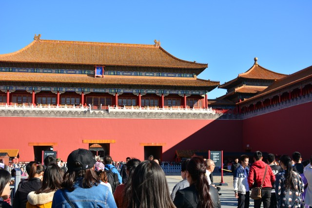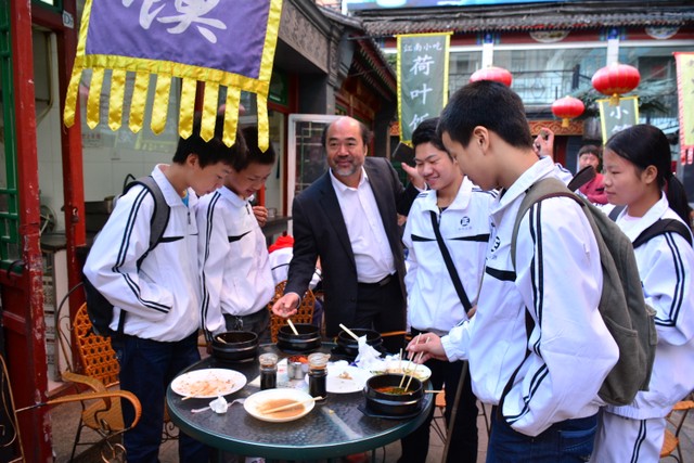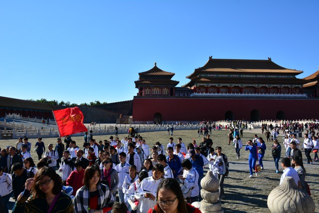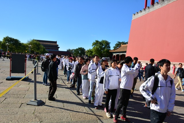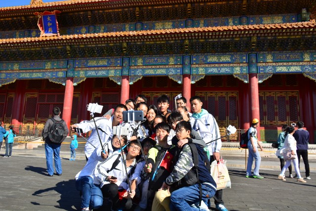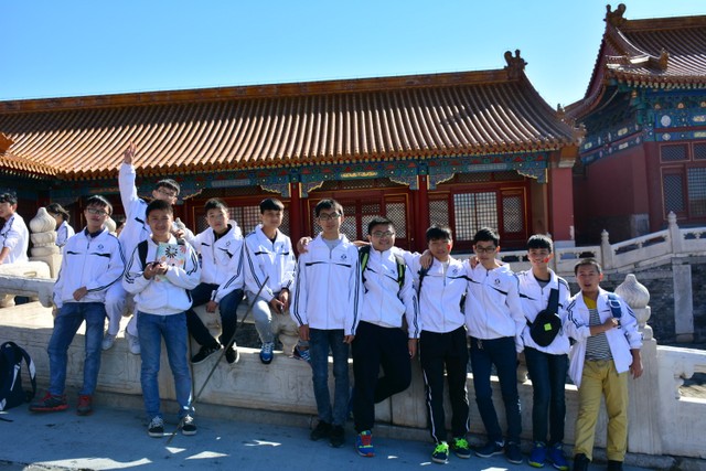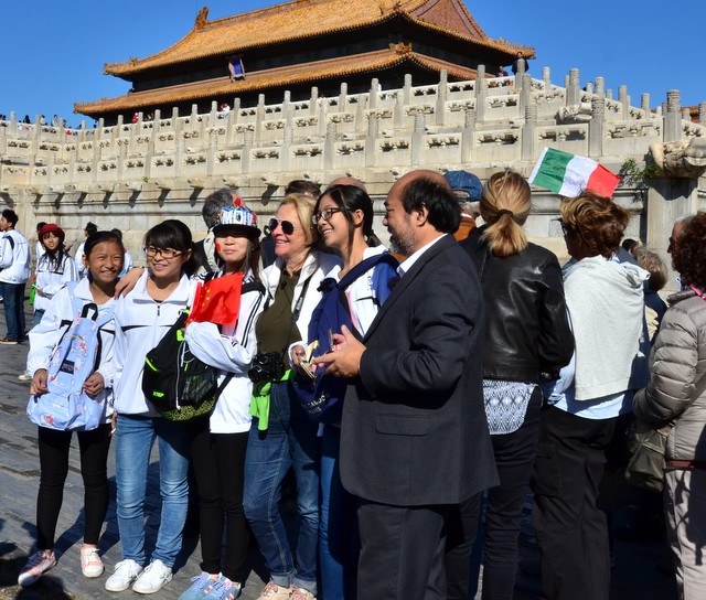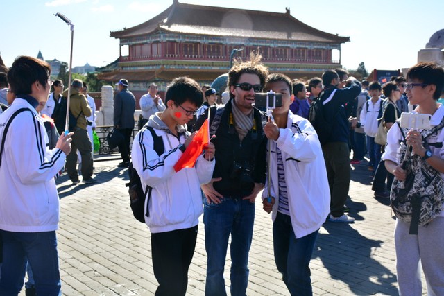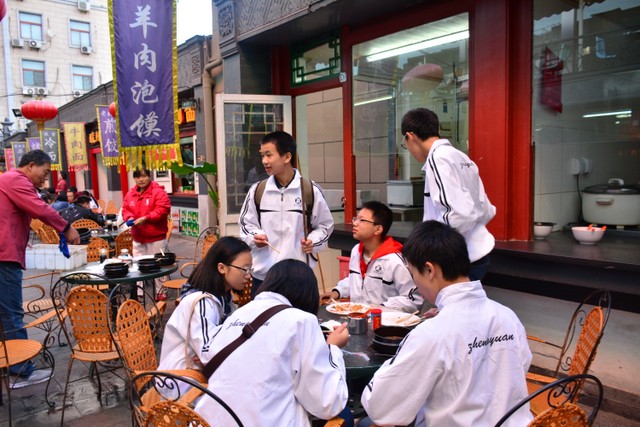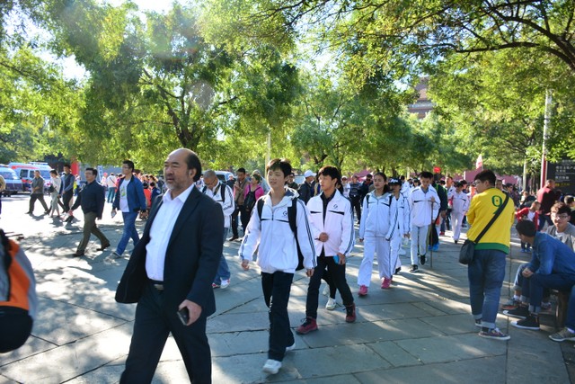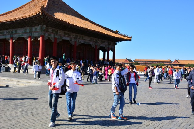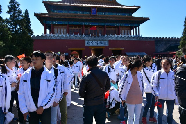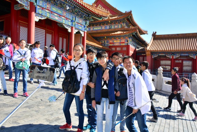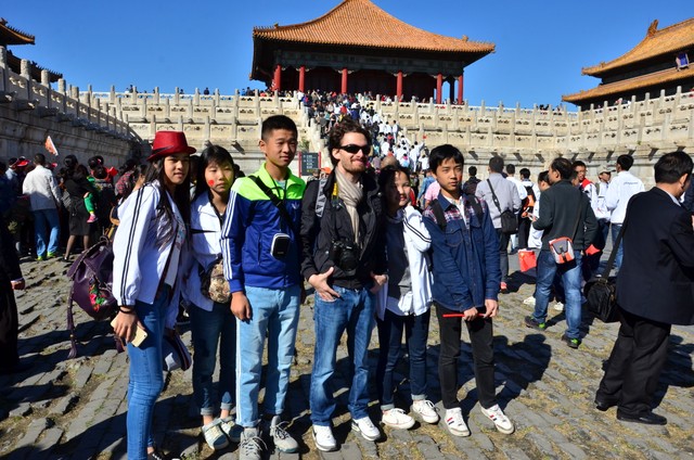 记者在故宫采访正源学生。好像这个姑娘已经在火车上接受过一回采访了。