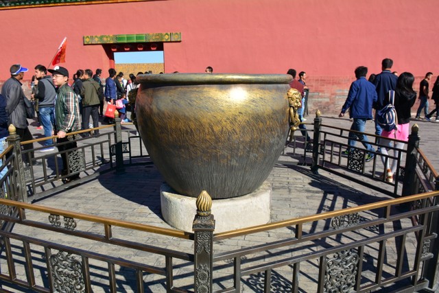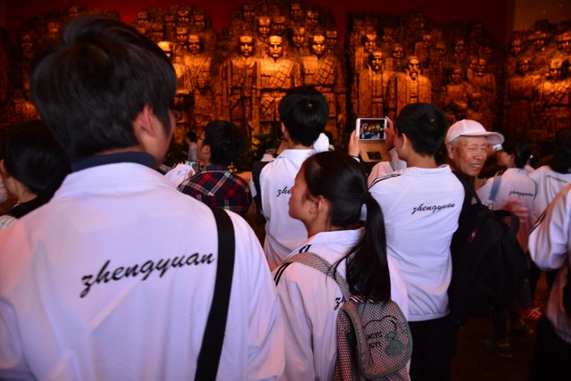 好多游人叫孩子用手试擦这口缸,说是可以考状元。