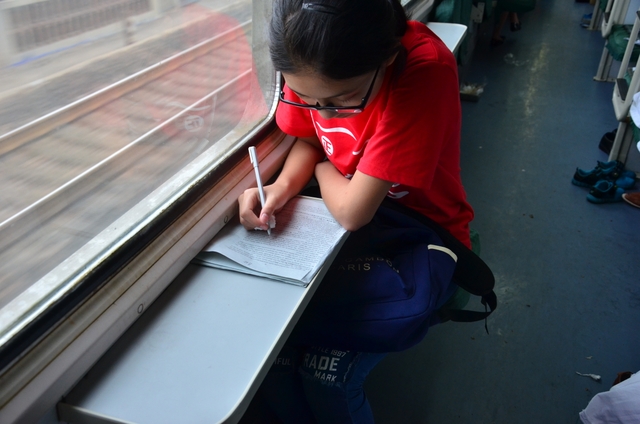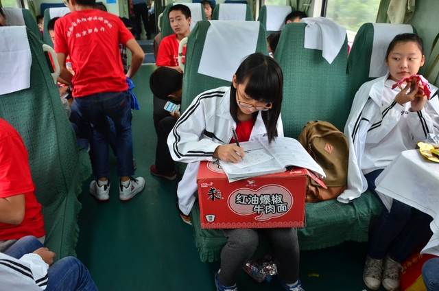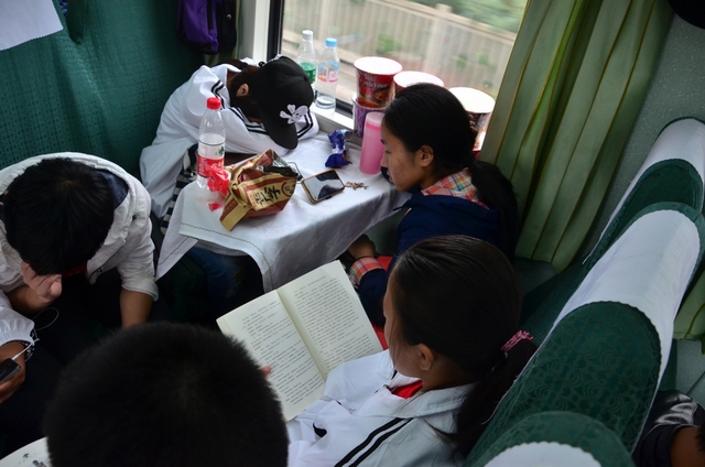可是,在旅途中,我们还是发现,有些同学没有“听指挥”,他们在相对不需要紧跟队伍的地方,比如火车上、住宿处,有的拿出书在看,有的在做题。他们是否是“装模作样”,不得而知,因为我们没问,我们不忍心打搅那份宁静。