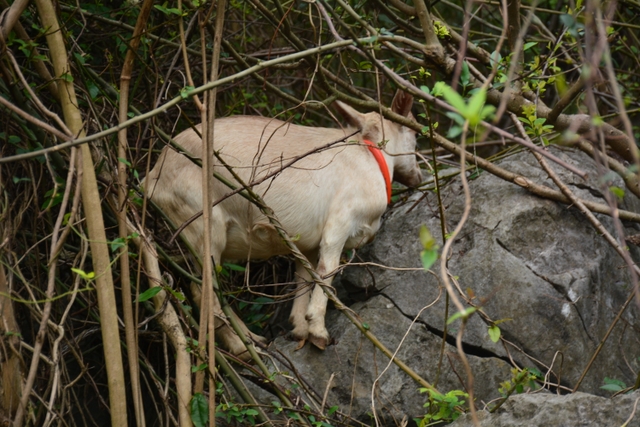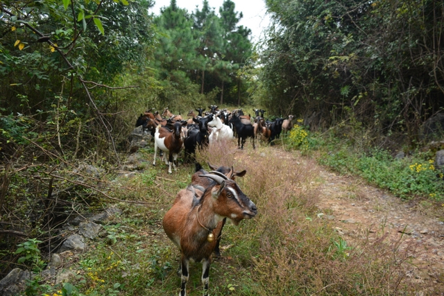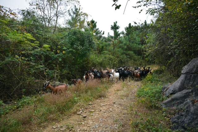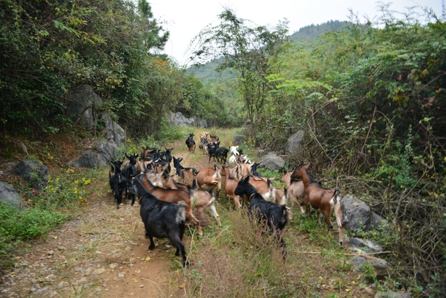 饱餐一顿后,大家扛起锄头朝溶洞——五家岩进发。一路上,但见山路两边怪石嶙峋,树木葱茏,鸡鸣鸟叫,尤其是几群山羊引起了我们极大的兴趣。据说羊倌原来也在外打工,近几年回乡养羊,收获颇丰。他的山羊不吃饲料,只吃满山的青草树叶,所谓神农尝百草。这羊肉,其营养价值可想而知。