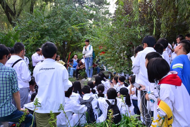 见面会后,励志学生分成7个组,各由几个志愿者学长带着在北大校园里边走边聊,交流彼此的学习、理想、人生。之后,在著名的未名湖畔,大家集合,聆听学长演讲。