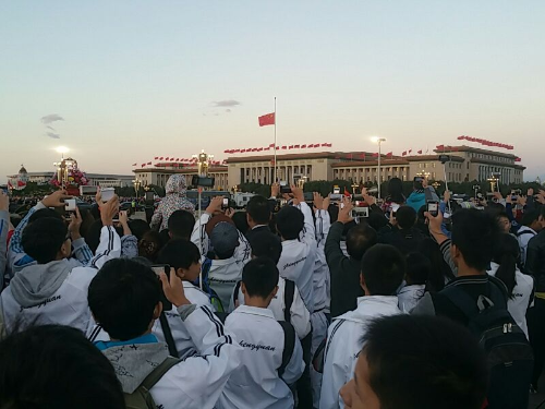 10月1日清晨,大家来到天安门广场看升旗仪式。看着国旗仪仗队迈着整齐的步伐走向旗杆, 激昂的国歌奏响,五星红旗迎着朝阳缓缓升起,所有人都在凝视着鲜艳的五星红旗……那一刻,大家都激动万分,都为自己是一个中国人而感动骄傲和自豪。