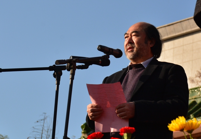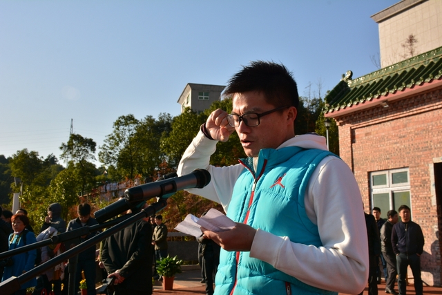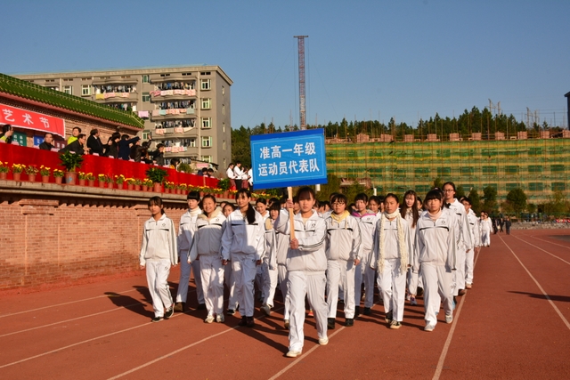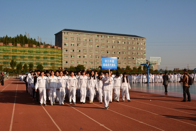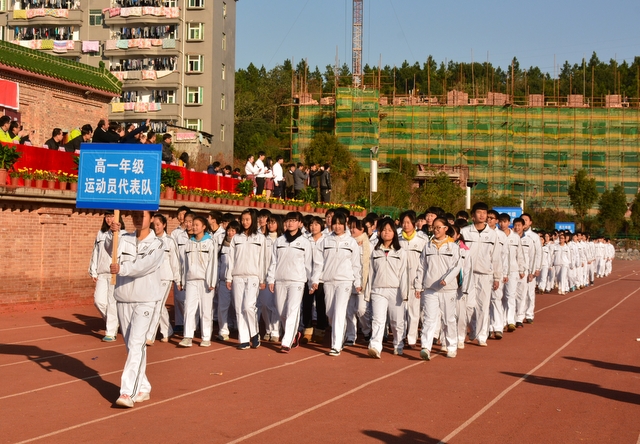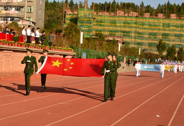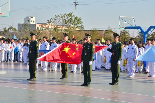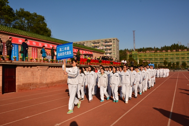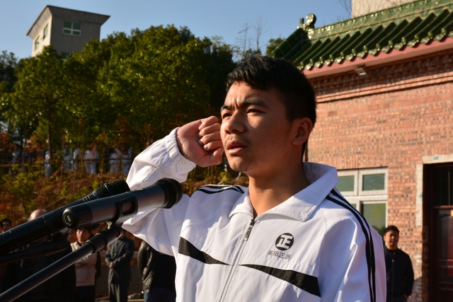 接下来是各方队入场。第一个出场的是国旗方队。高一年级的四位国旗手高擎国旗,步履铿锵,雄健地走向主席台。鲜艳的国旗由包括伍中豪、刘铁超、伍若兰等数以万计耒阳烈士的鲜血染就,时刻昭示着我们:今天和平、安宁的幸福生活是来之不易的,我们要百倍珍惜!