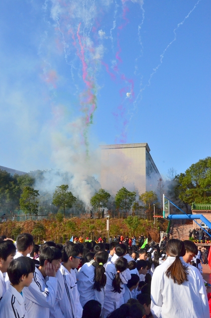 在各年级运动员方队入场后,学校办公室主任朱明之主持开幕式。罗校长致开幕词,并宣布正源学校首届中学生体育艺术节开幕!此时,代表着正源创办十周年的十束礼花,带着呼啸,直冲云霄,一挂挂鞭炮响彻天际。